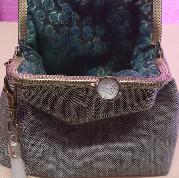 The purse has a kiss lock frame with a crystal clasp.