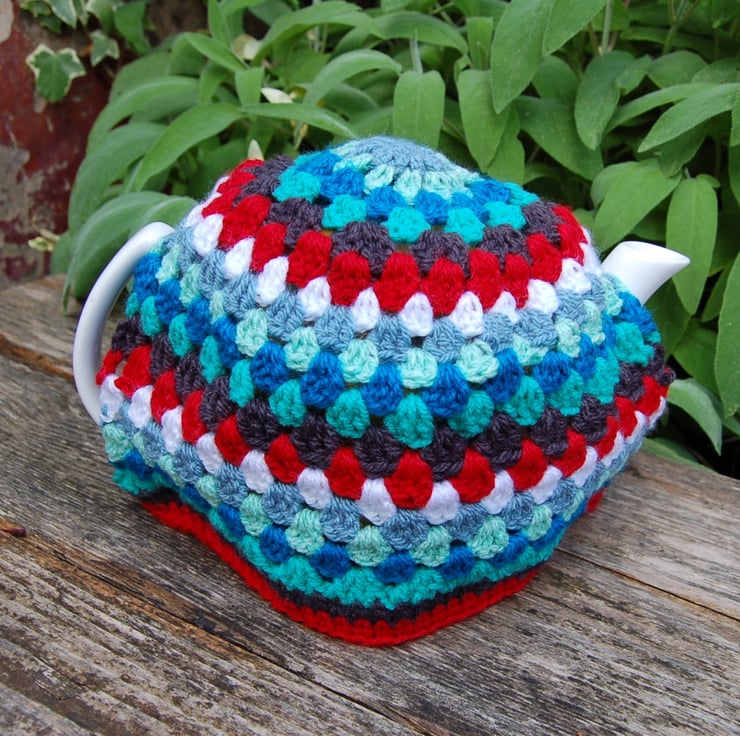 A lovely colourful crochet tea cosy for a large standard size teapot. I've crocheted it using left over acrylic yarn from other projects using a traditional granny stitch design. It's a great way to use all those small balls of yarn and save them from landfill.