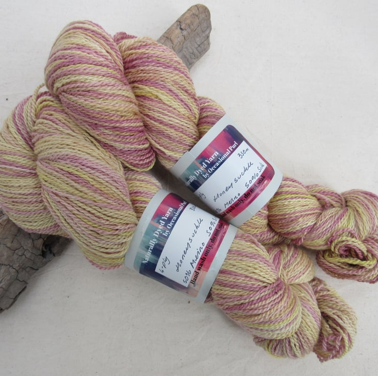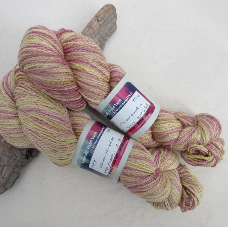 100g soft 50% Merino, 50% silk sockweight / 4-ply yarn dyed with a range of natural plant dyes to give a shaded pattern of pink and yellow.