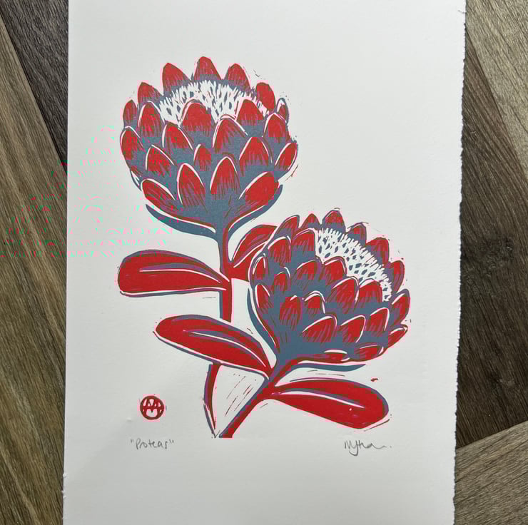 Original handmade two block lino print of two protea flowers - the national flower of South Africa - in vibrant colours of dark coral red and powder blue. Printed using oil based safe wash Cranfield inks and printed on Somerset Satin 250gsm relief printing paper. Each print has one deckled edge.