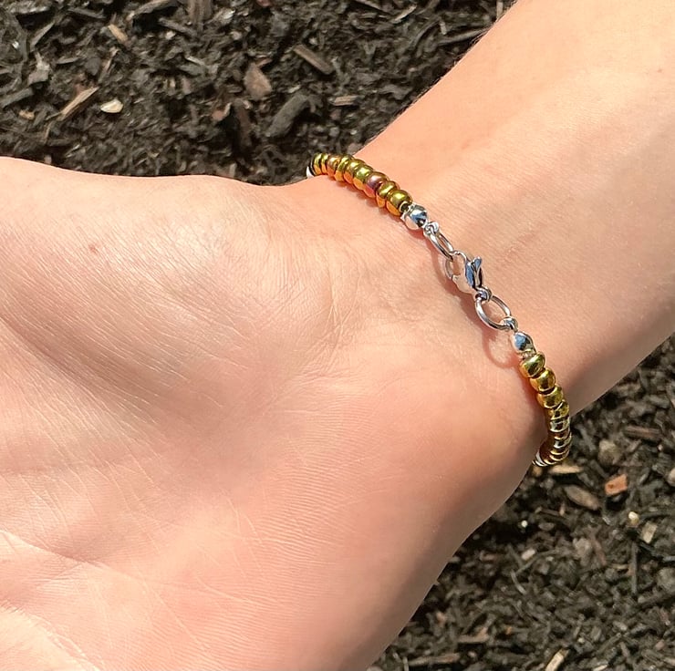 This dainty little bracelet has been made with glass seed beads, that have been threaded onto strong fishing line and fastened with a metal clasp. Perfect for that boho, beach life style.
