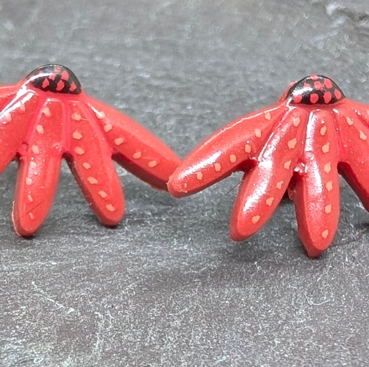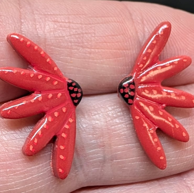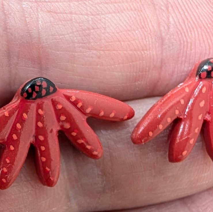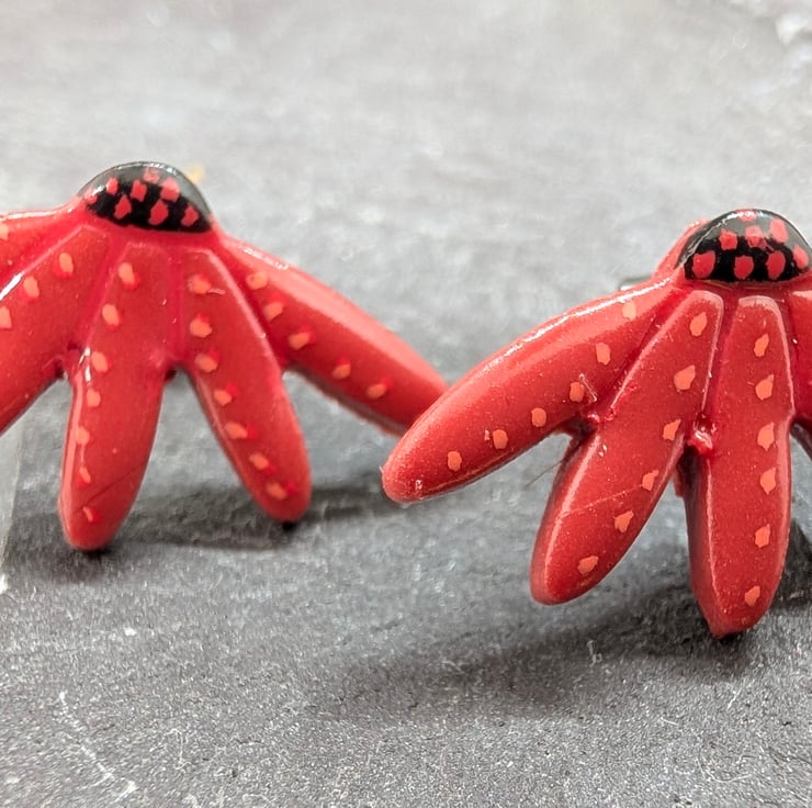 These handmade polymer clay stud earrings feature a charming flower design, crafted in vibrant red with delicate dotted detailing. Each petal is shaped and textured to resemble a blooming flower, while the black center and pink dots adds a playful, artistic touch.