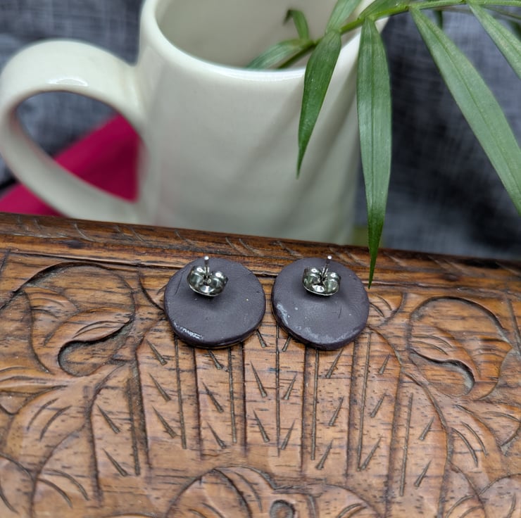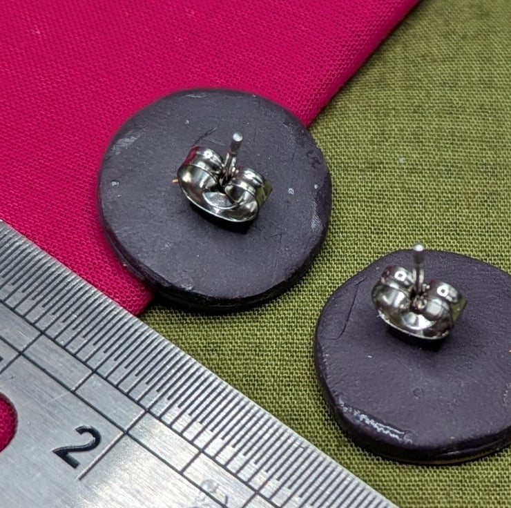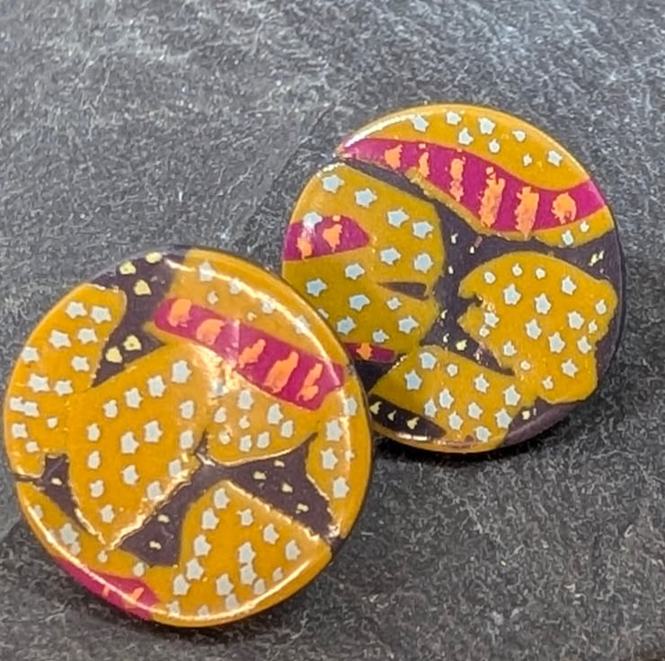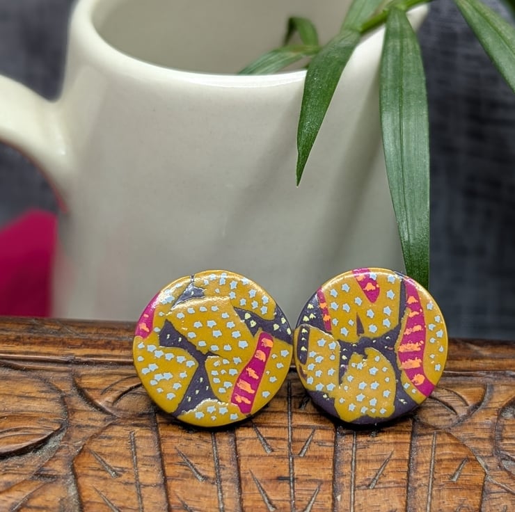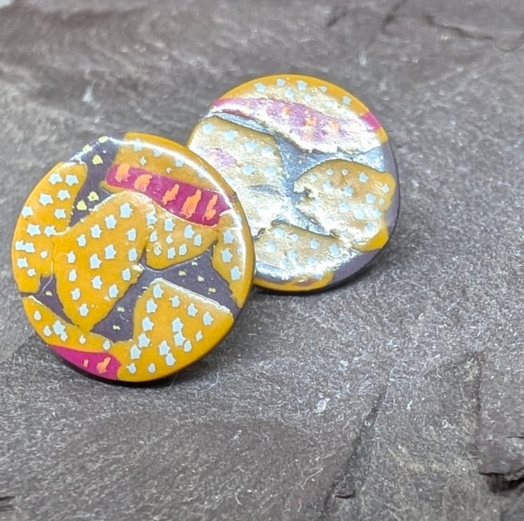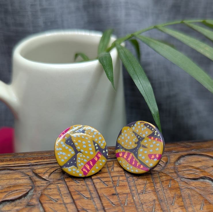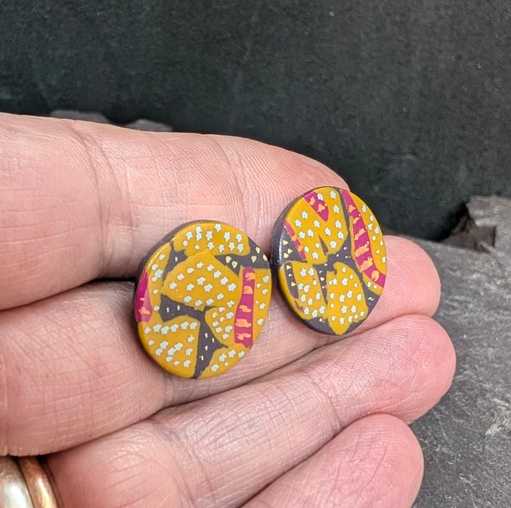 These vibrant polymer clay stud earrings feature a unique hand-painted abstract design in warm mustard yellow, deep grey, and vivid pink, brought to life with delicate pale grey and pale pink dotted details. Each piece is sealed with a glossy varnish for a smooth, durable finish.