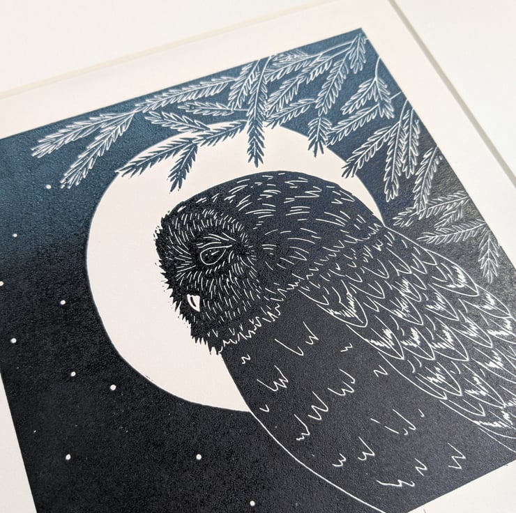 Moonlit Owl Linocut Print, Moon Gazing Owl