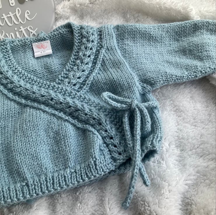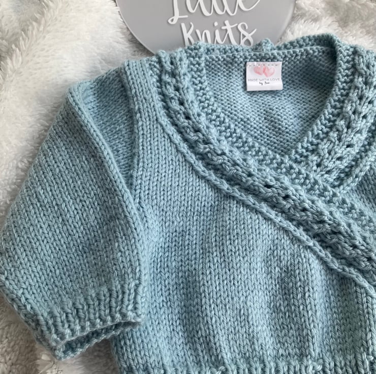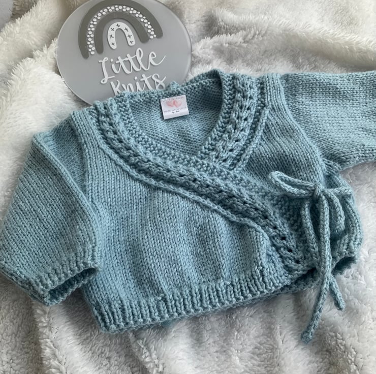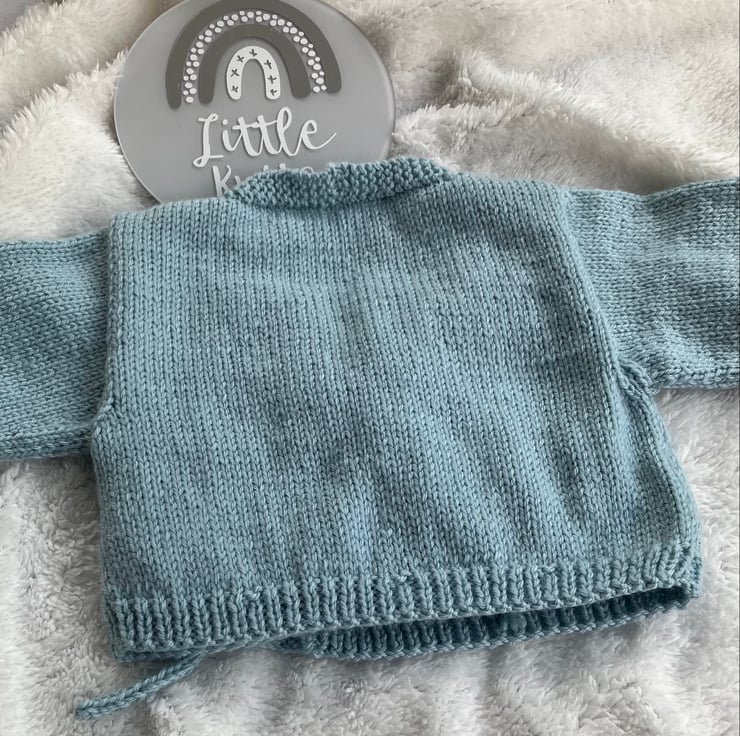 Hand-knitted baby’s wrap-over cardigan. I have knitted this little cardigan in a light duck-egg blue coloured soft merino/acrylic blend yarn. The cardigan is edged with a cable knit trim and fastens with a matching hand-knitted cord.