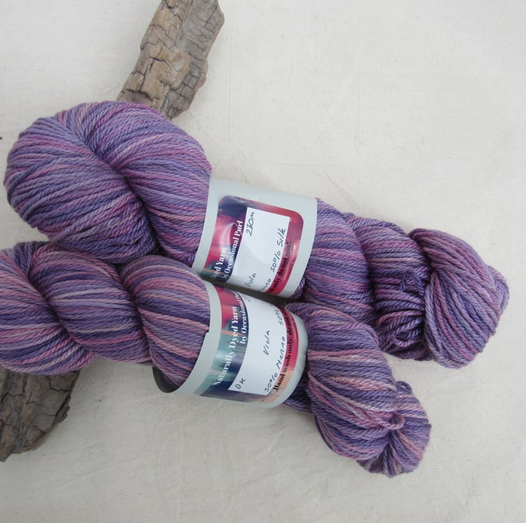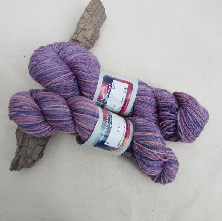 100g soft 50% Merino, 50% silk DK weight yarn dyed with a range of natural plant dyes to give a shaded pattern of varying purples and violets.