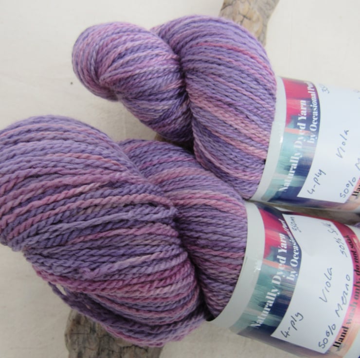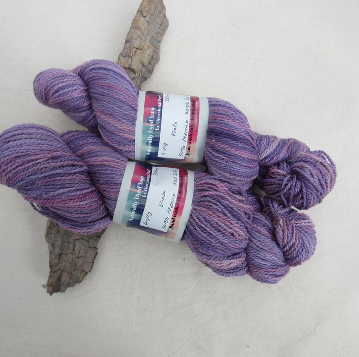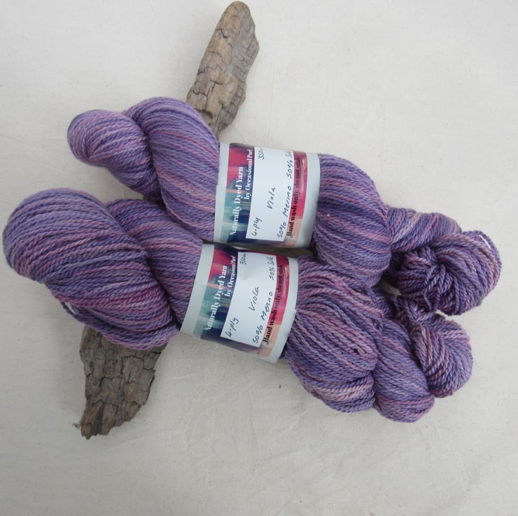 100g soft 50% Merino, 50% silk sockweight / 4-ply yarn dyed with a range of natural plant dyes to give a shaded pattern of purple and violet