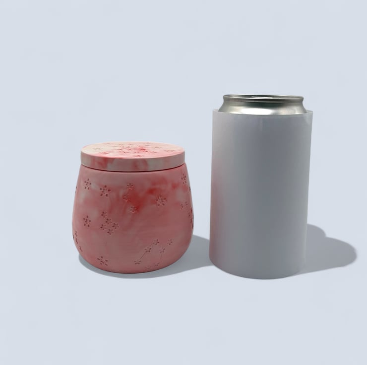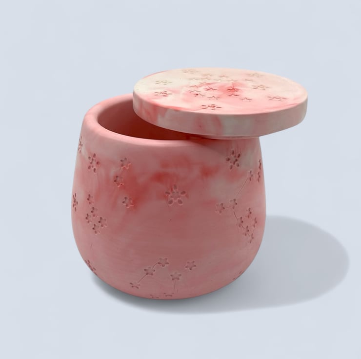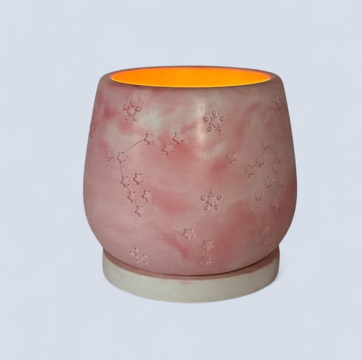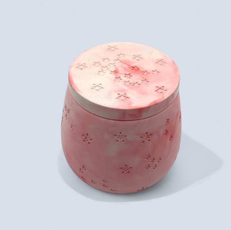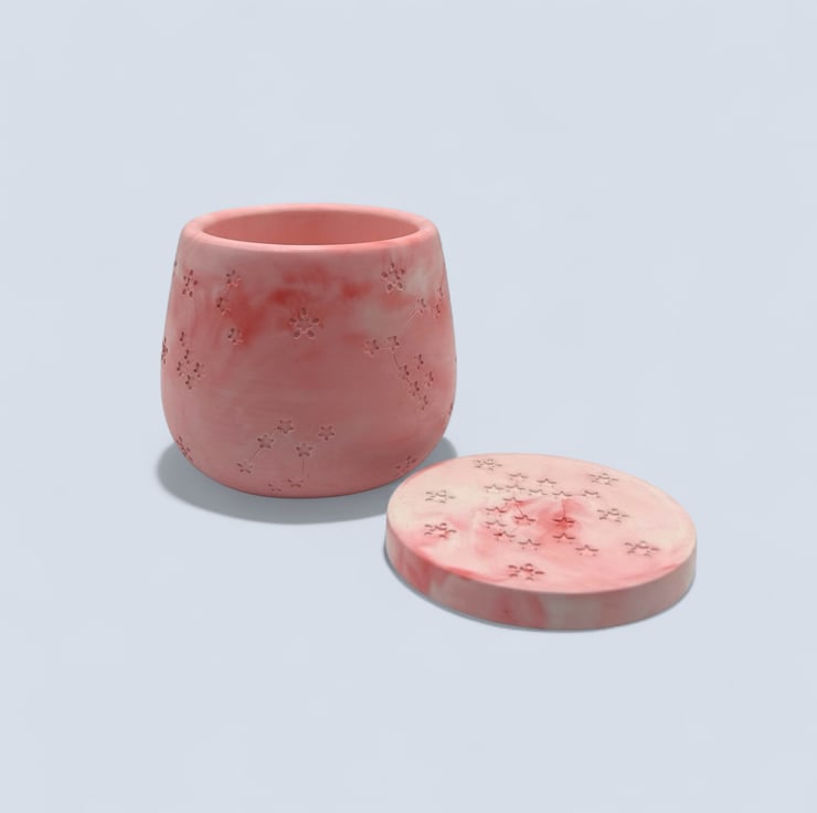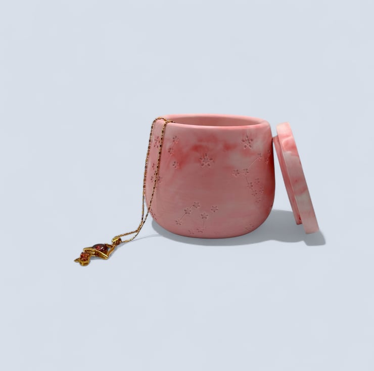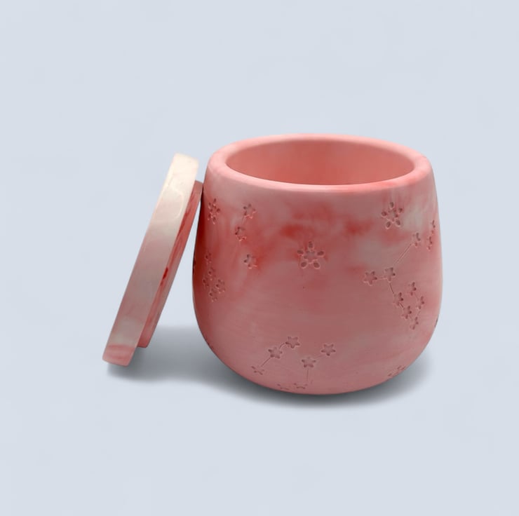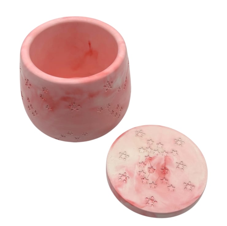 This flamingo pink trinket jar has a lid; the pot bulges slightly from the base before tapering towards the rim. It showcases a soft, pink marbling effect and is beautifully decorated with stars and constellations gracing the lid and exterior. Crafted from Crystacast, this pot boasts a dense, smooth finish that resembles marble. The outside of the pot has been polished with natural wax to give it a soft satin sheen. It is perfect for storing your cherished keepsakes, jewellery, or other little treasures. Plus, it can elegantly function as a candle jar for tealights or pillar candles, with the lid as a convenient coaster to protect your surfaces from heat.