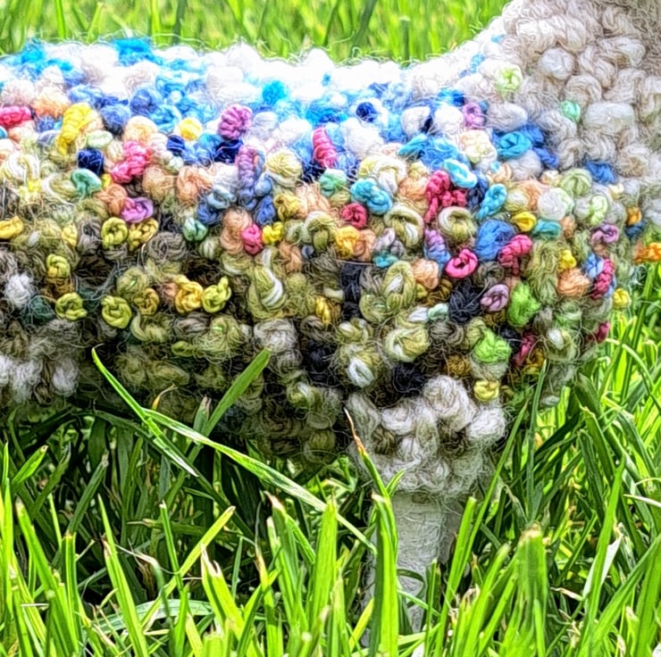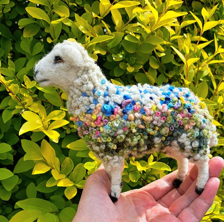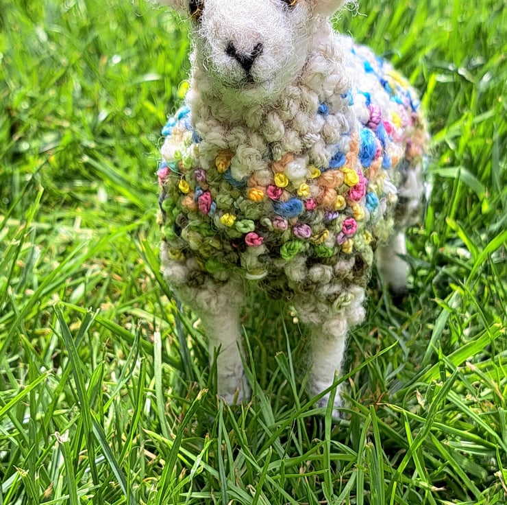 This little flower meadow sheep sculpture has been needle felted over a wire armature to allow gentle posing.I have stitched over the body with lot's of french knots in pure wool and embroidery threads.