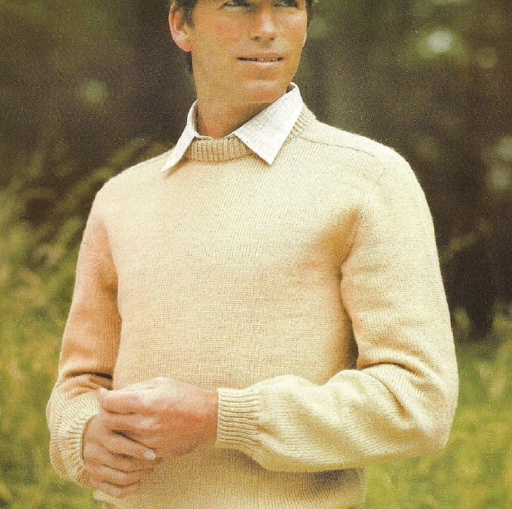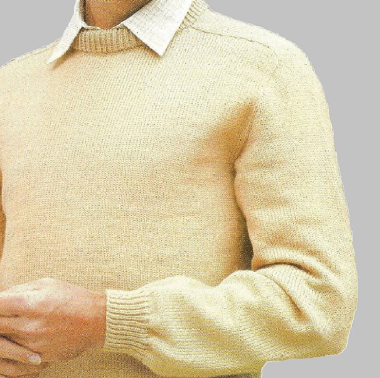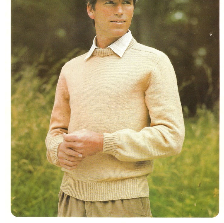 This hand knit PATTERN is for a man's sweater. To fit chest: 86 to 112 cm or 34 to 44 inches. Knitted in 4 ply yarn using 3 mm and 3.5 mm knitting needles.