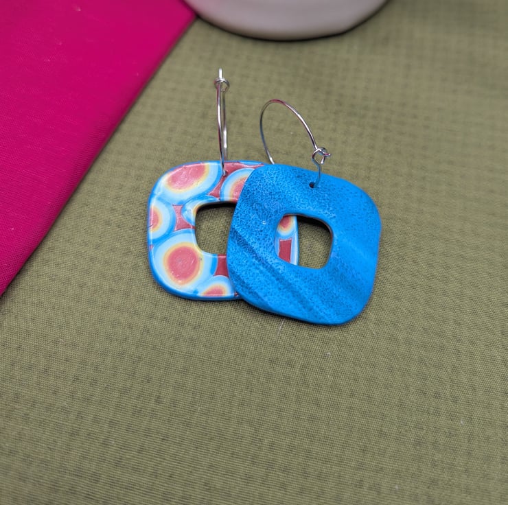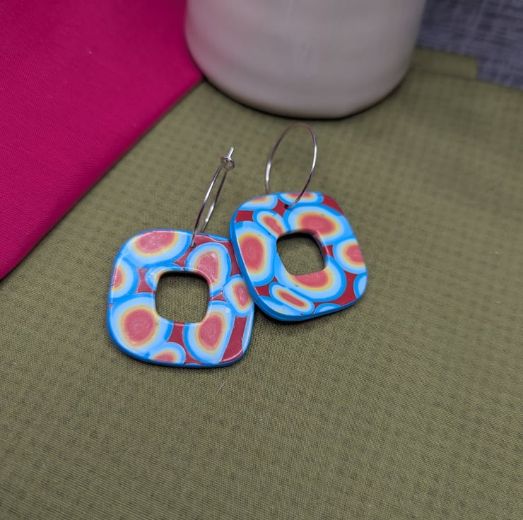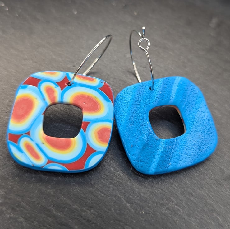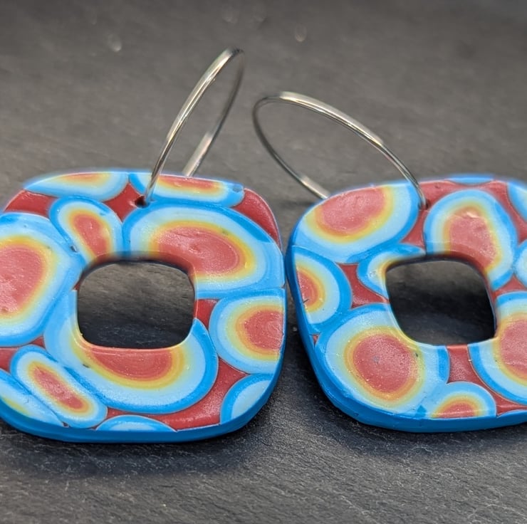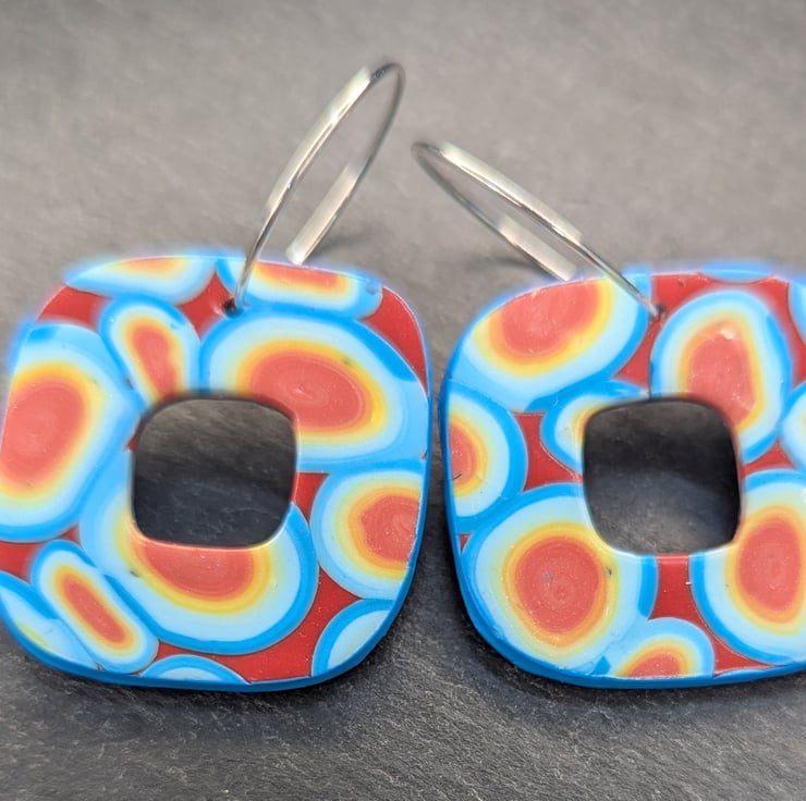 These vibrant square dangle earrings are handmade from polymer clay using a striking retro-inspired colour palette of orange-red, turquoise blue, and buttery yellow. Each earring features a soft square cut-out shape with smooth, rounded edges and a playful swirl pattern that feels both nostalgic and contemporary.