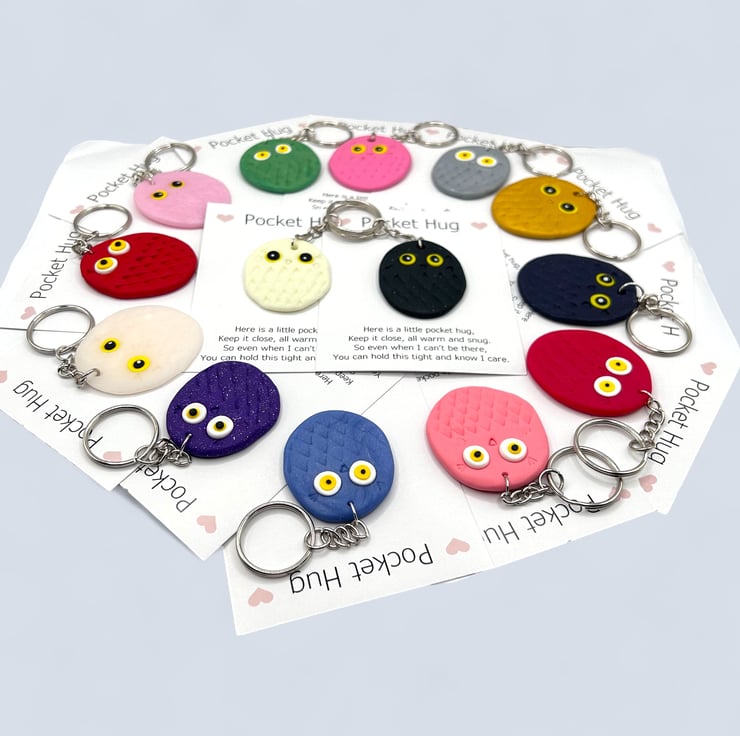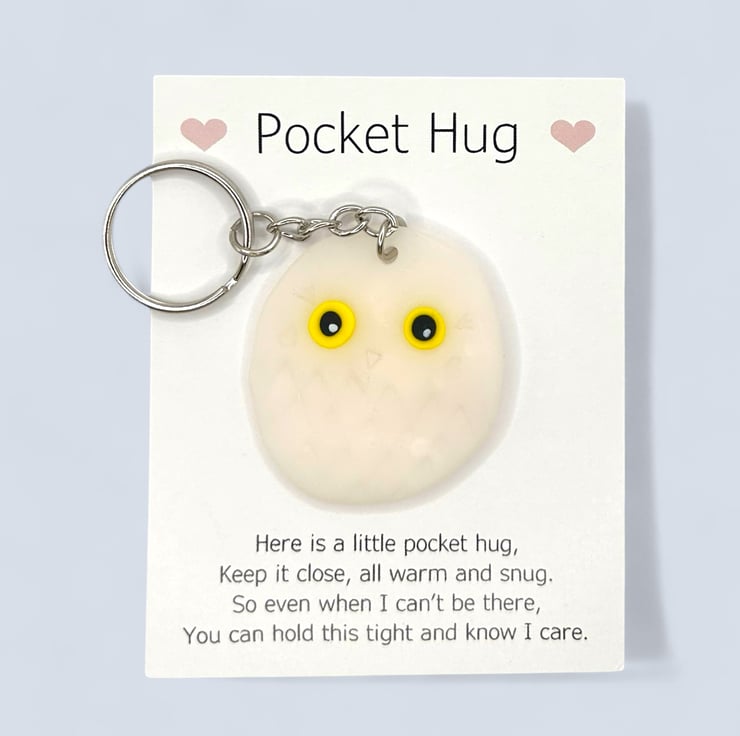 This adorable little white pocket hug owl is handcrafted from polymer clay and features my original design. It is translucent and slightly see-through. It includes a chain and a sturdy split ring, making it perfect for a keychain or a bag charm. It would make a lovely gift for a loved one, friend, or anyone you want to let know you’re thinking of them.