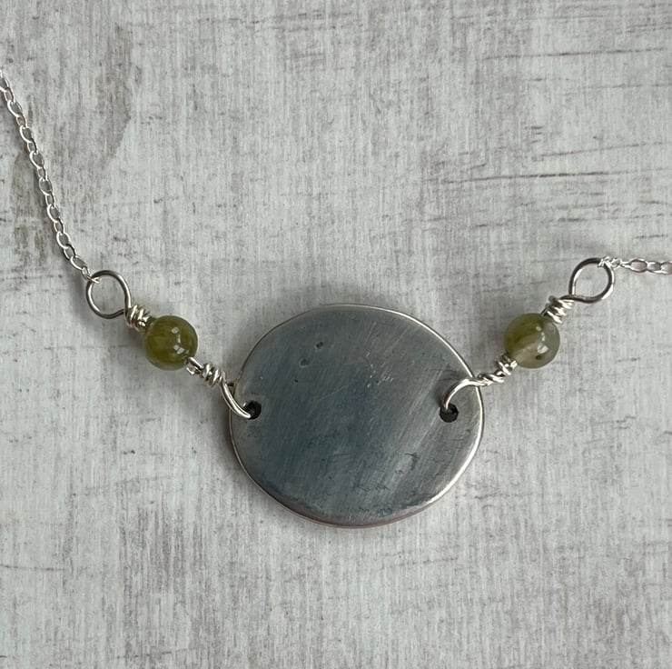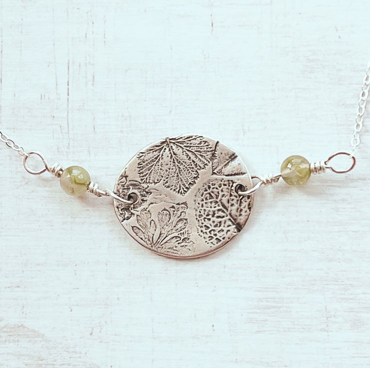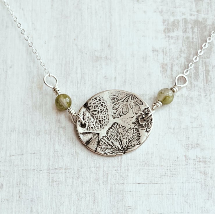 Silver pendant with impression of different leaves . This piece is smooth and flat with an organic hand made feel . I have given it a patina which brings out the details of the leaves. Embellished with green tourmaline beads and attached to a silver chain. Approx length of chain is 20 inches . Care has been taken to achieve a smooth and tactile finish. See photo with coin for scale.
