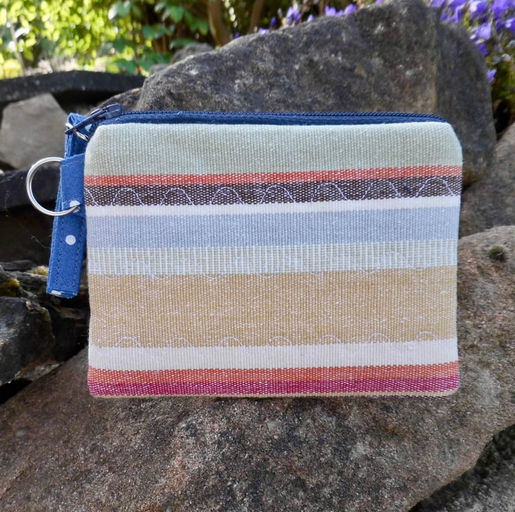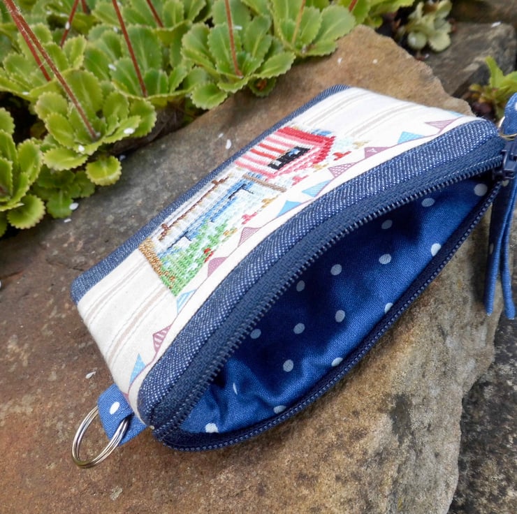Flat style with a navy zip finished with a tab to match the lining. I've inserted a key ring into one side to make it easy to clips to your key ring or inside your bag.