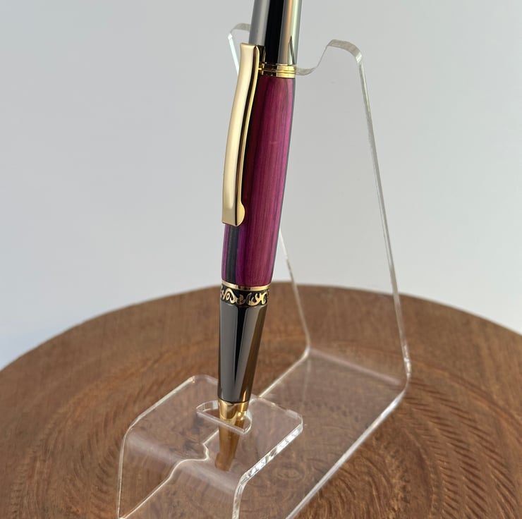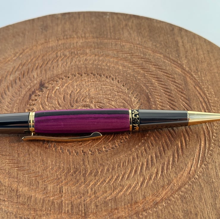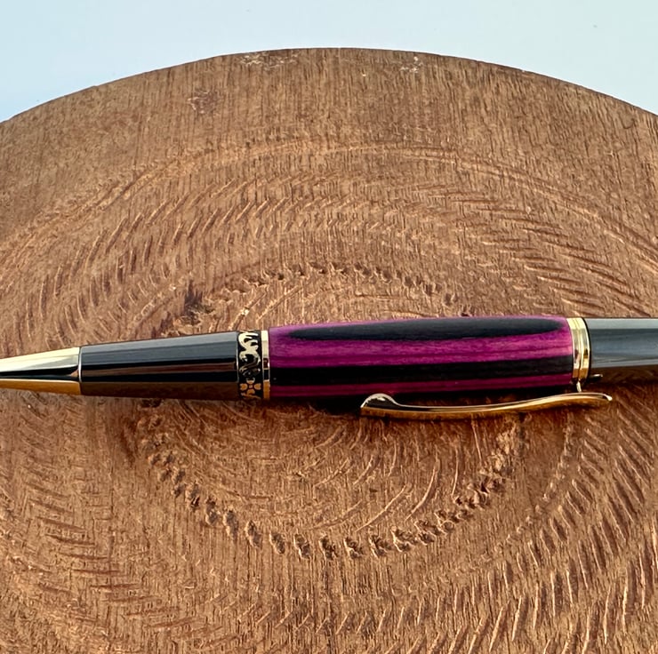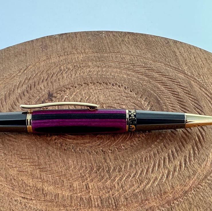 Wooden ball point pen. The wood is black and purple, the metalwork is gold. This pen takes the Parker style refill.