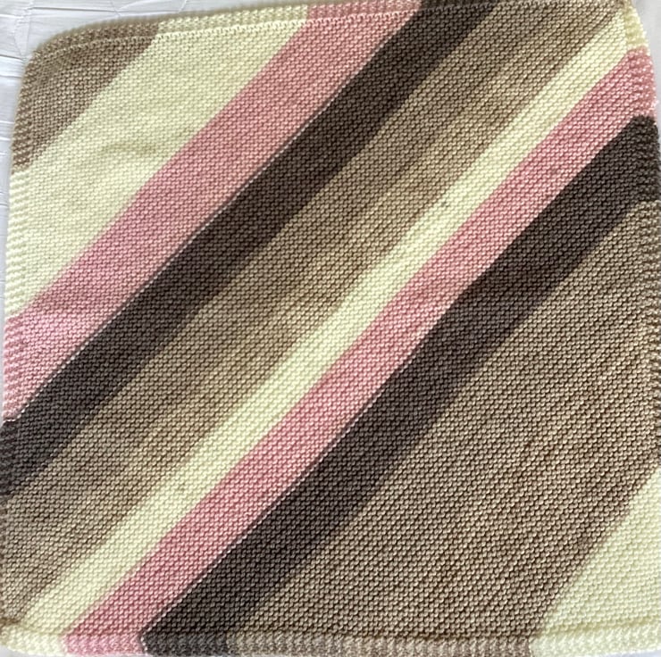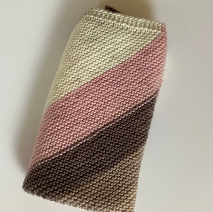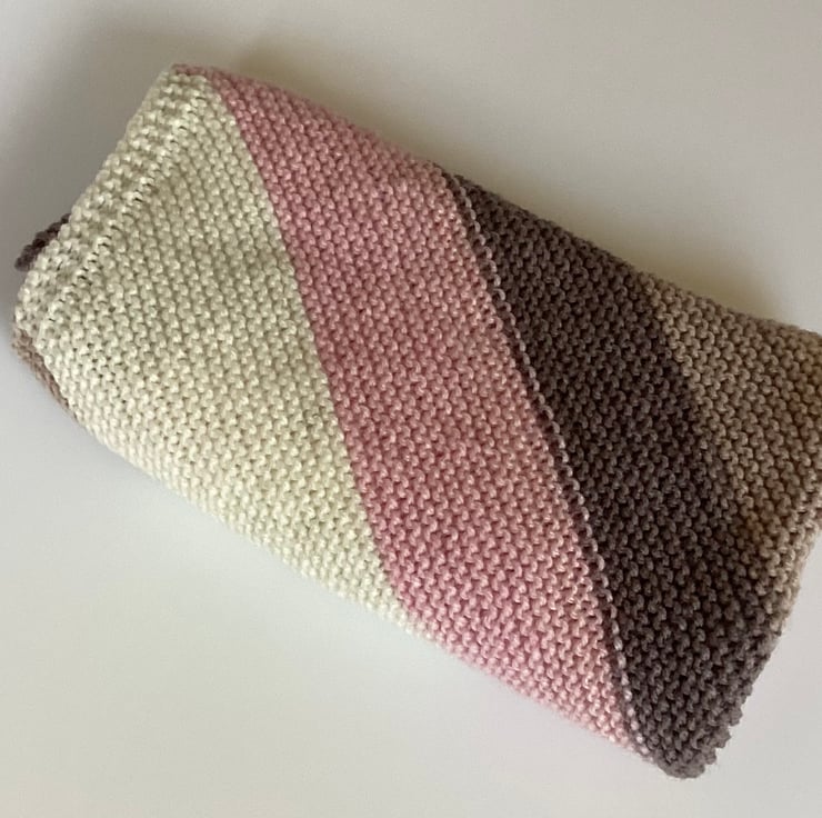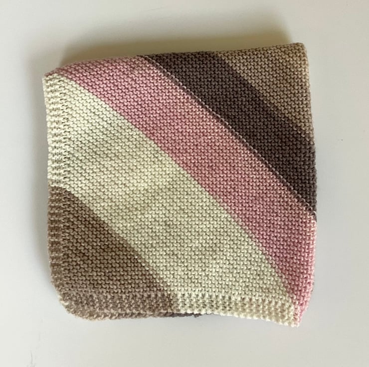 Lovely little baby blanket hand knitted by me in my smoke and pet free Suffolk home. I have used a top quality baby aran yarn in gorgeous shades of pink, cream and coffee. It has been knitted from corner to corner in garter stitch and is the perfect size for a car seat, crib or pram.it measures a 64cm square approximately. Would make a lovely gift for a new baby.