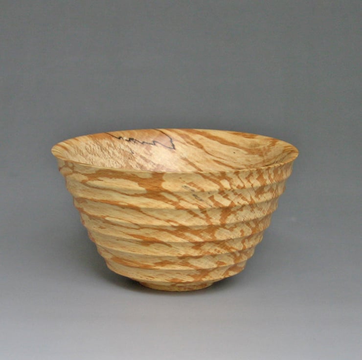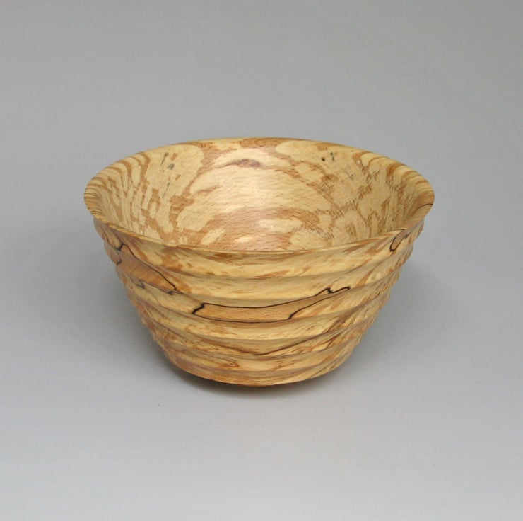 A pretty little dish turned from spalted ash. The outside of the vessel has been scalloped to give an interesting character. A hard wearing wax finish has been applied to give a pleasing sheen.