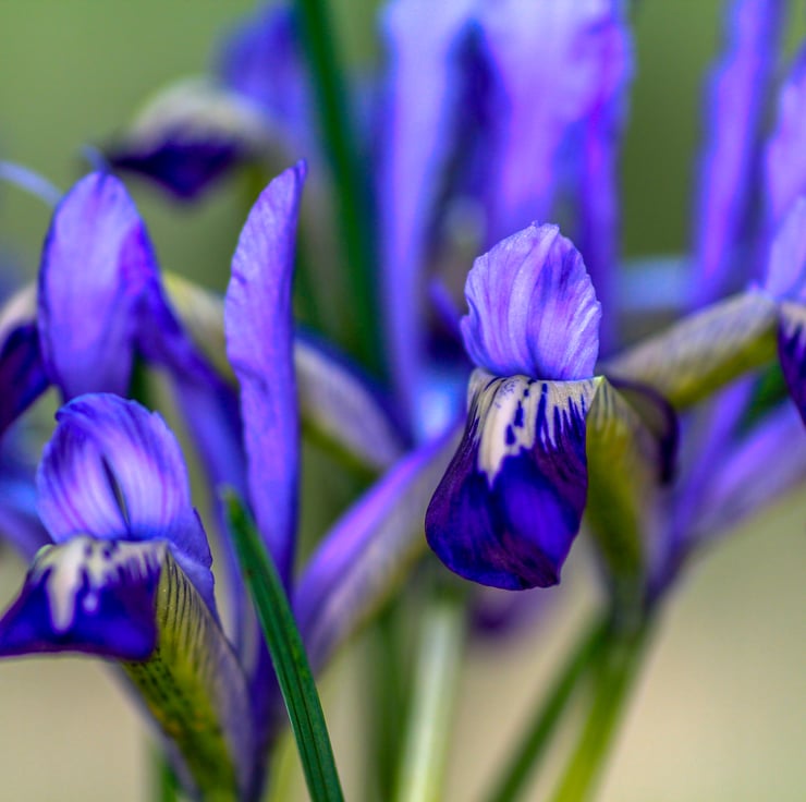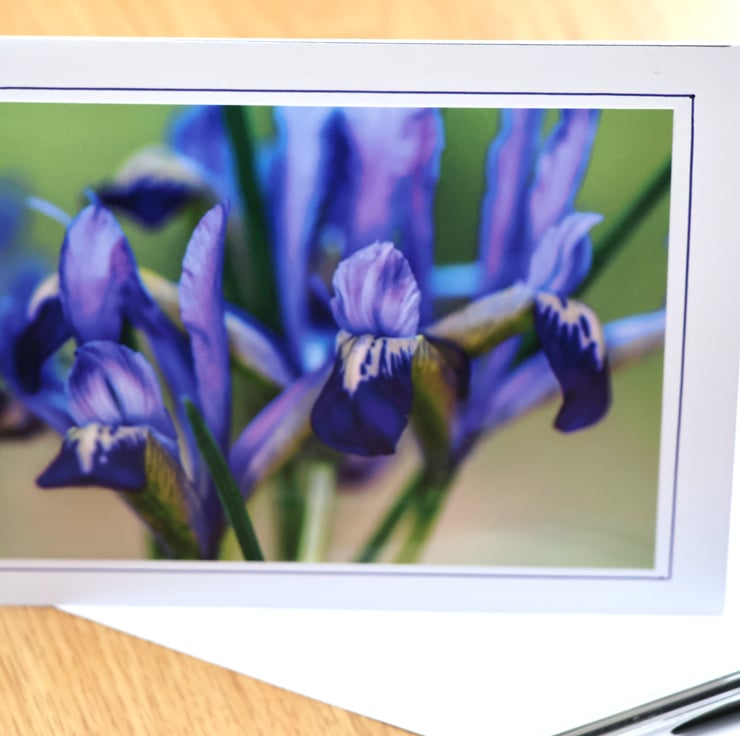 A professionally printed 6 x 4 inch approx. card of a group of Blue Iris Reticulata flower heads.. This is mounted on a 7 x 5 inch approx. plain white card, with a blank inner, left plain for you to add your own message. An envelope is included.