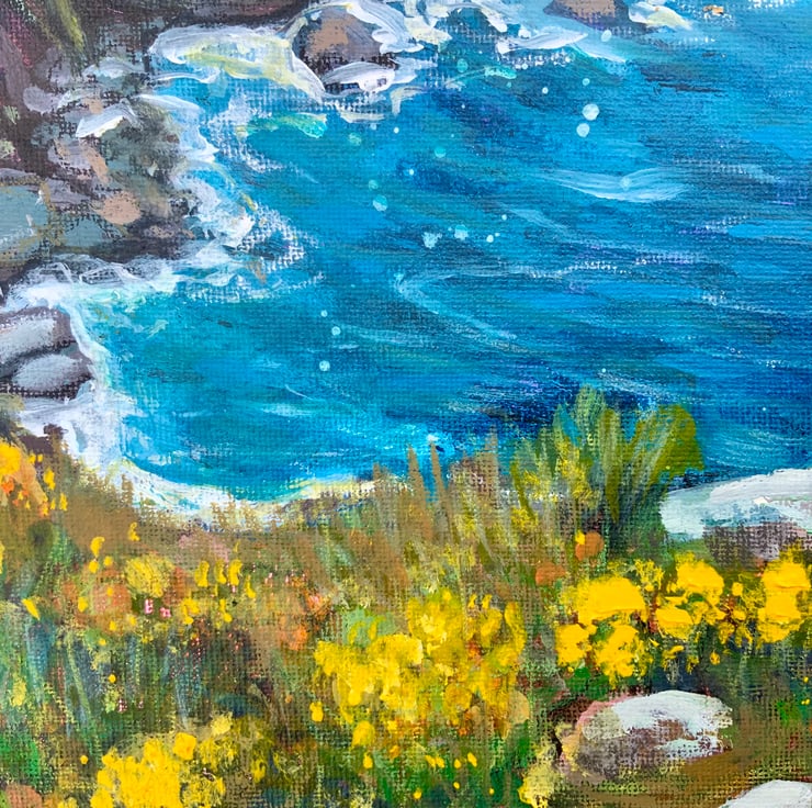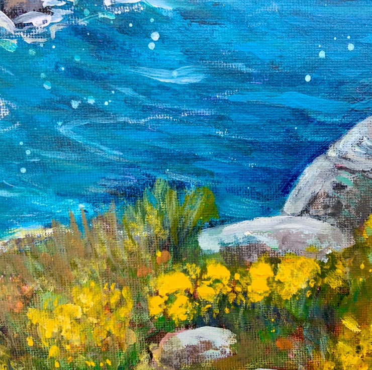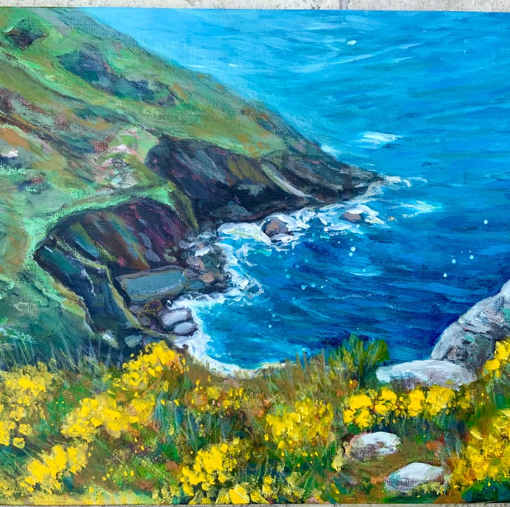 This is an acrylic painting painted on a canvas board. It measures approximately 30x25cm and comes unmounted and unframed allowing you to choose a frame in your own style. It is a painting of a Cornish cove near Zennor with the bright yellow gorse bushes on the cliffs, contrasting with the beautiful turquoise sea.
