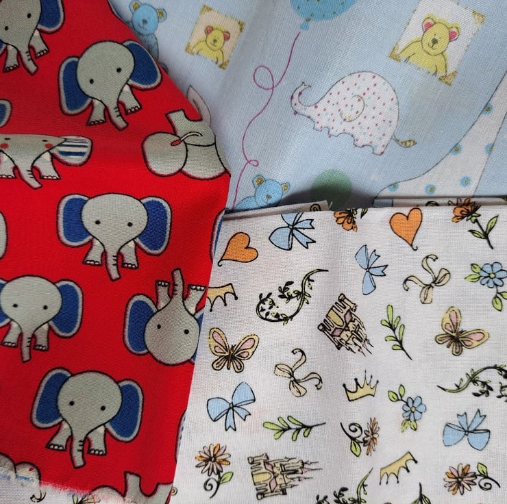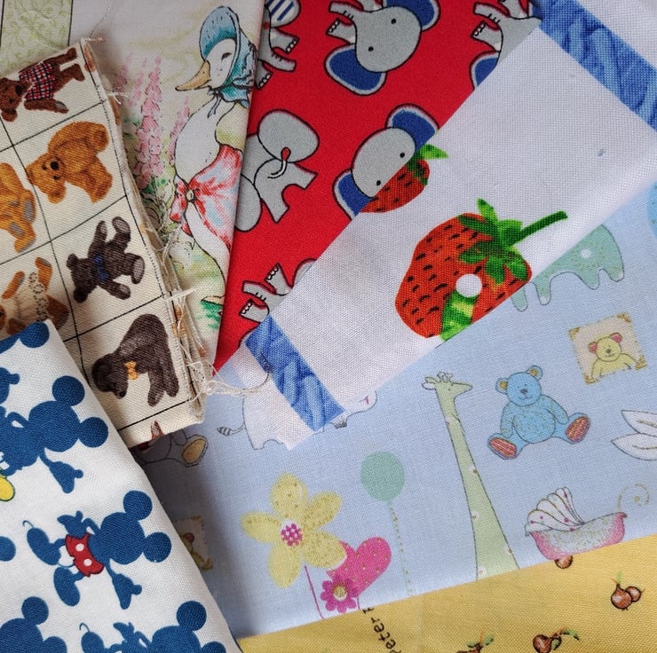 Prepare for a nostalgia rush! This 10-piece bundle is packed with beloved childhood images, including Peter Rabbit, the Very Hungry Caterpillar and Mickey Mouse, as well as some more generic children's designs. All cotton and some good-sized pieces, including two complete fat quarters.