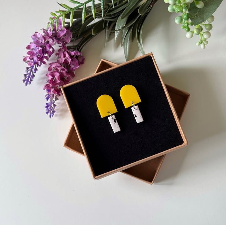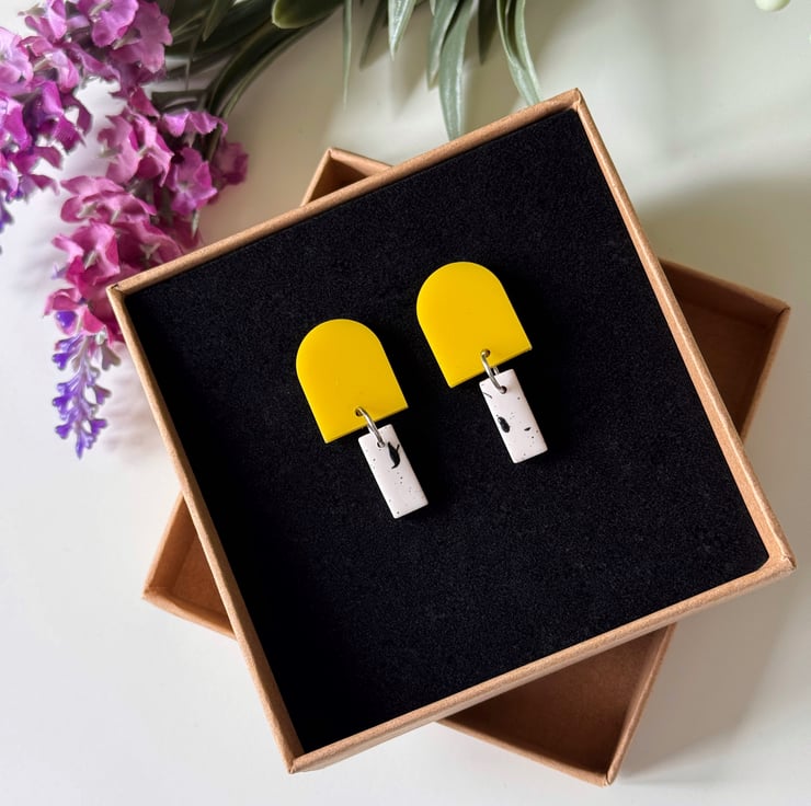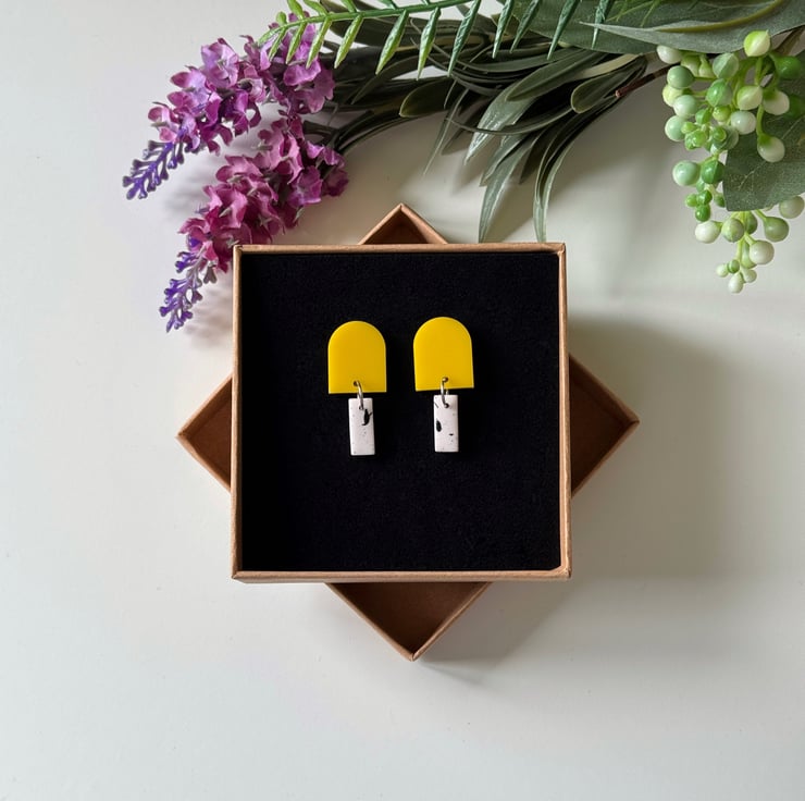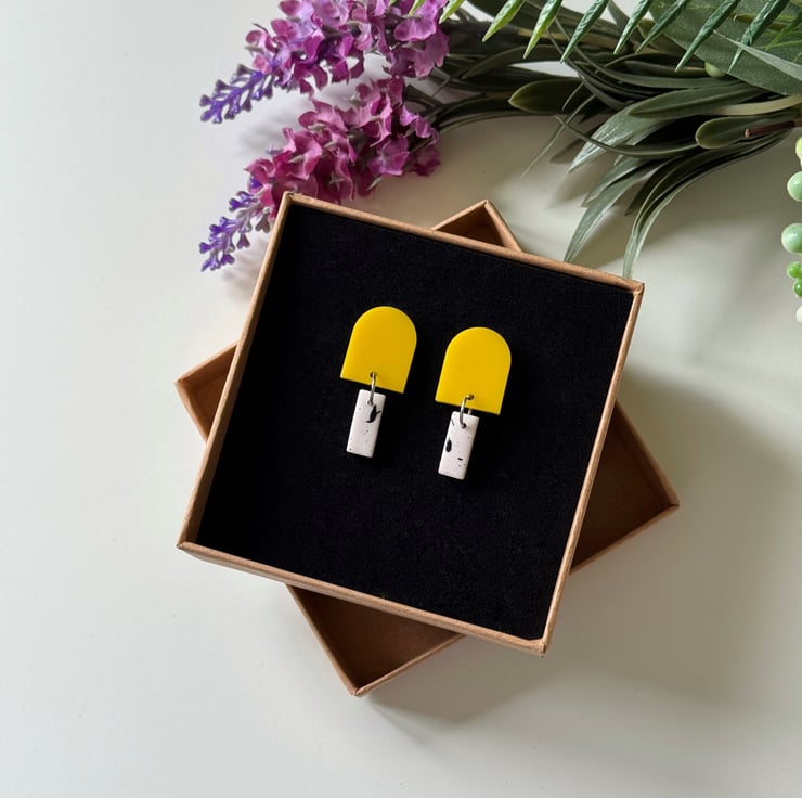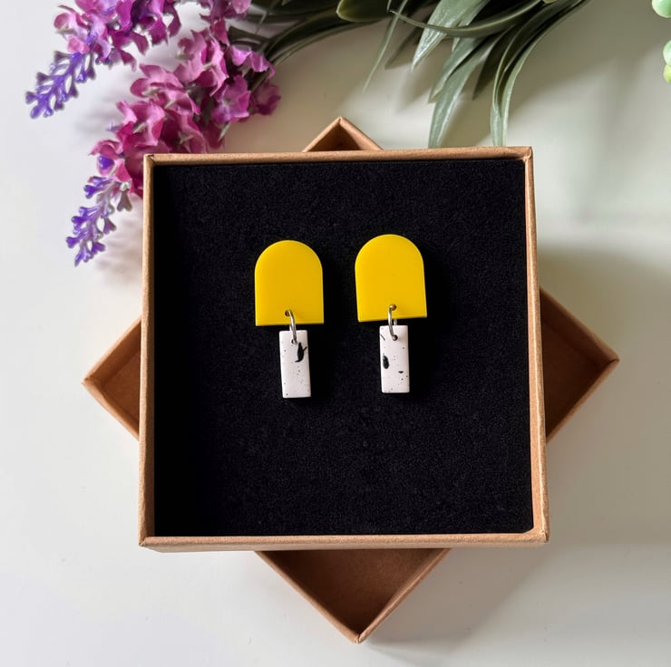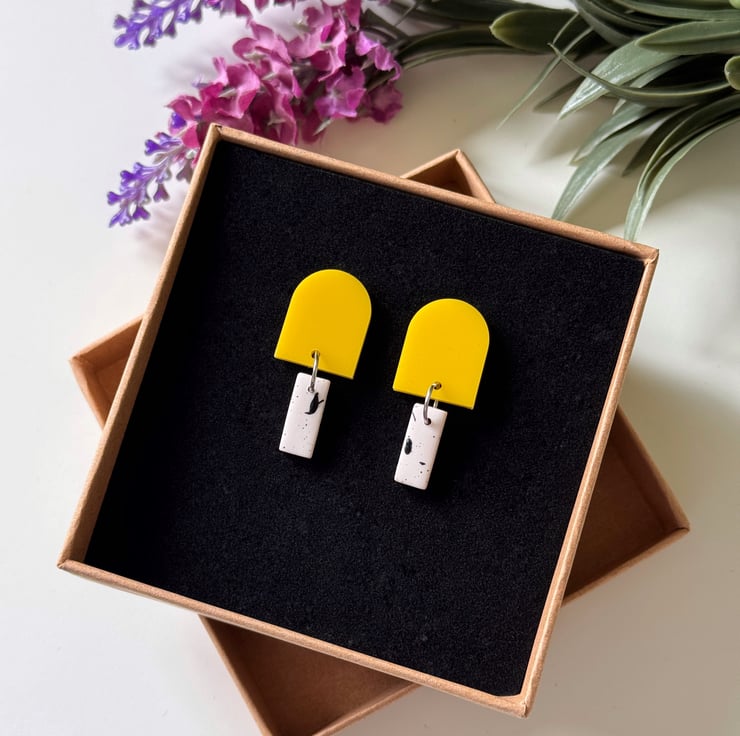 With dainty white polymer clay and acrylic paint splatter Rectangle Dangles.