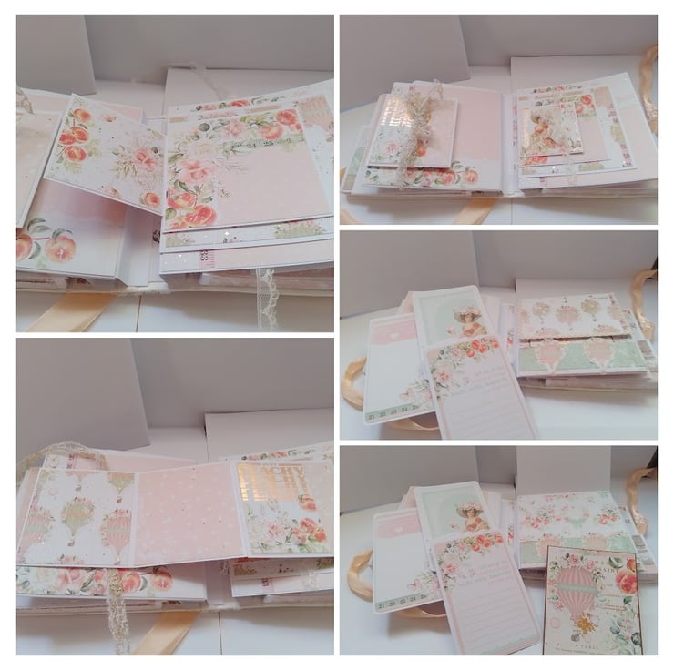 Beautiful 6.25" x 6.5" handmade album stored in a beautiful box made from chipboard and decorated as the album, with Prima Marketing Peach Tree papers. This album contains 2 removable booklets, 3 signatures with flaps and pullouts.
