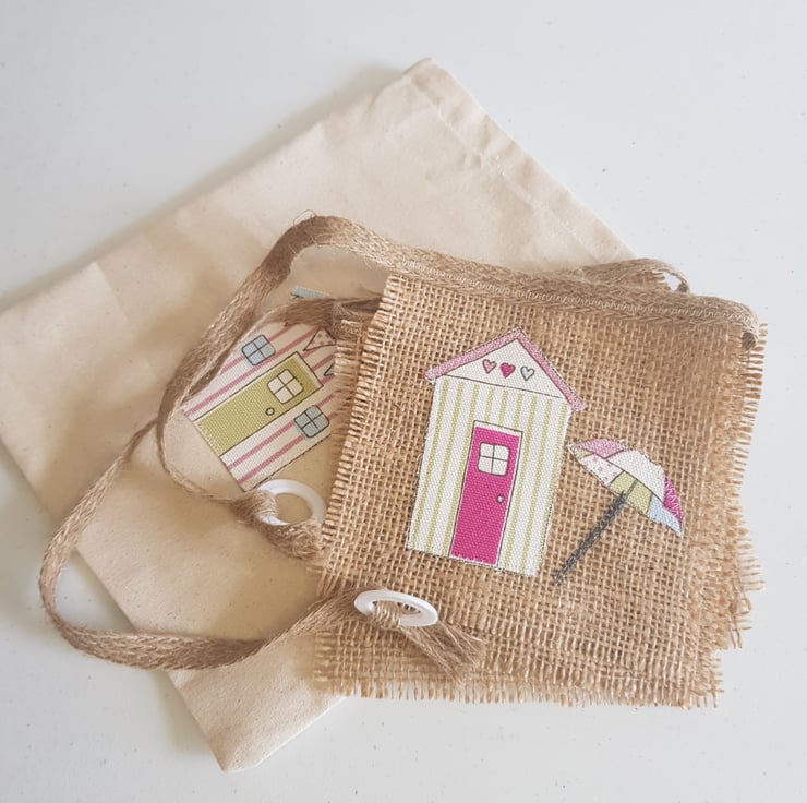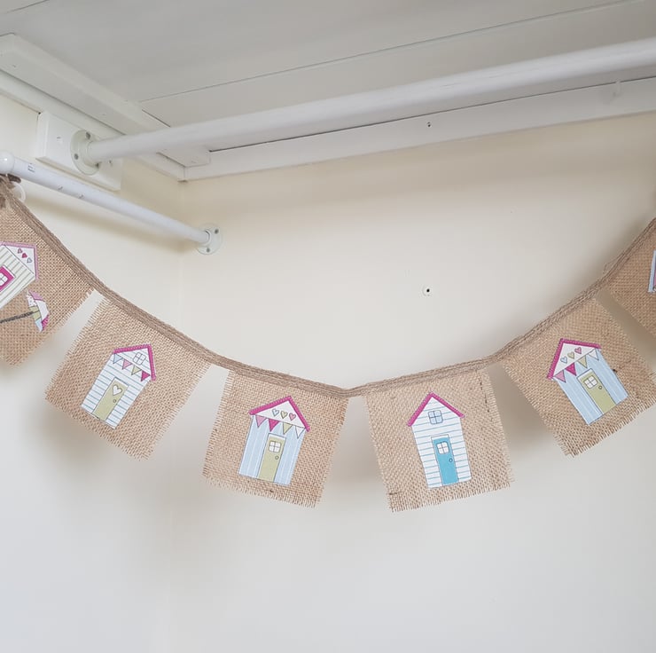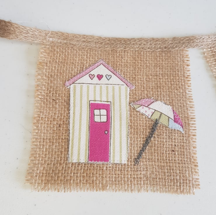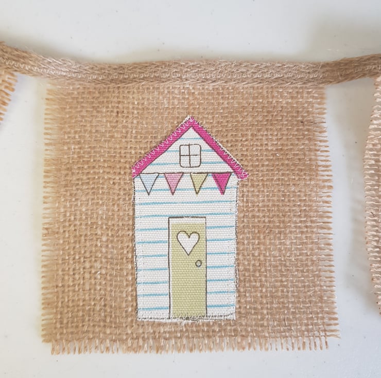 Consisting of 6 hessian squares onto which I have stitched little fabric beach huts left from remnants of fabric I had left over. Each square is approx 5" / 13cm. They are joined by approx 1.25m of jute tape. I have added some little rings (these are often used in fabric bundles so I would rather find a use for them than throw them away) .