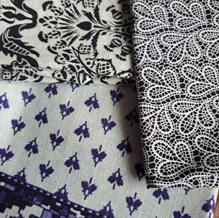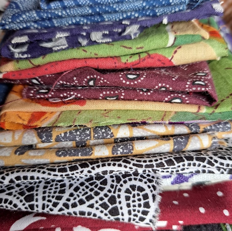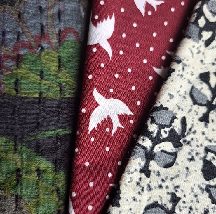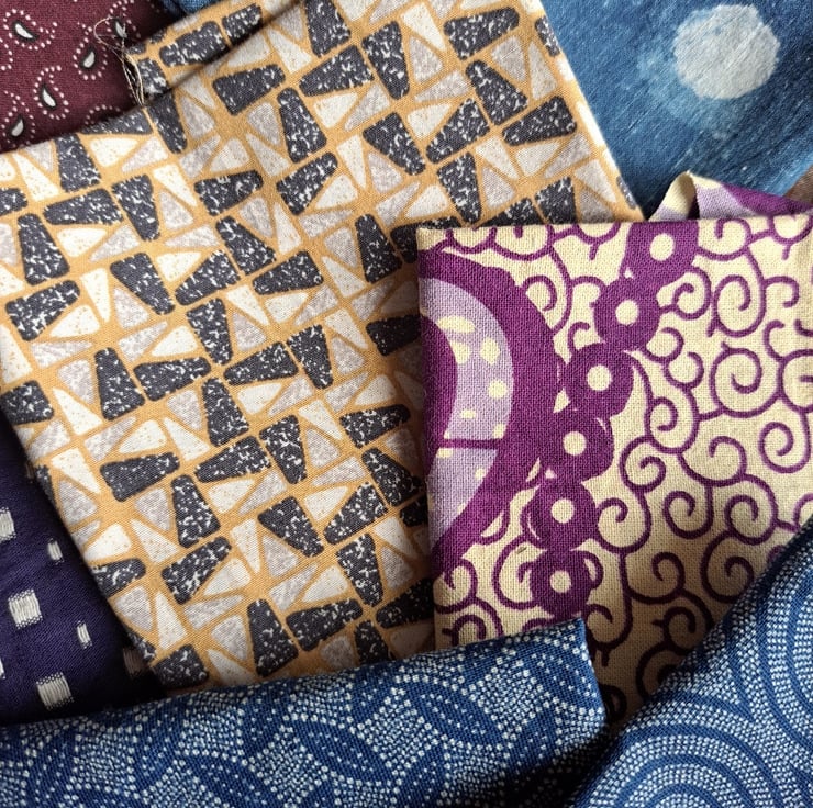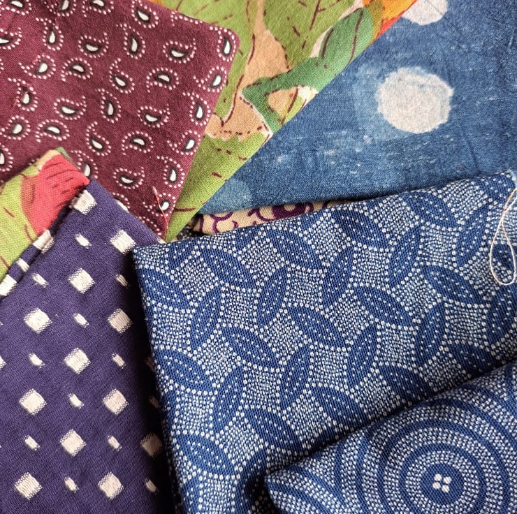 The 15 pieces of this eclectic bundle are pulled together by a theme of traditional design, from paisley to block print and from indigo to shweshwe. While most are genuine examples, some are inspired by traditional prints and blocks. A mix of repurposed, new and vintage fabrics.