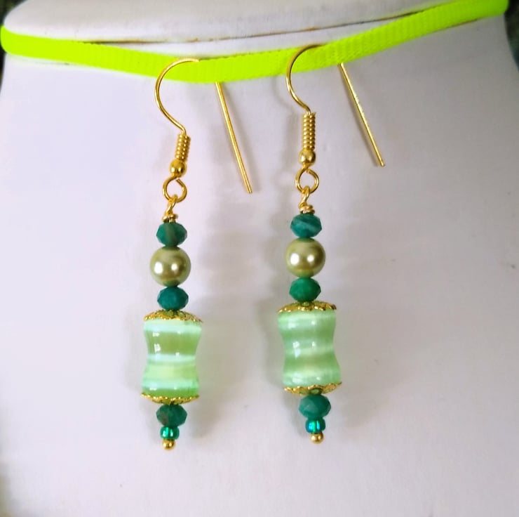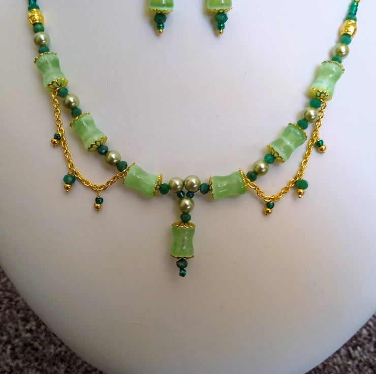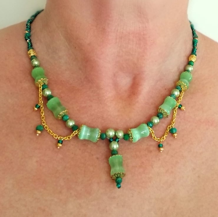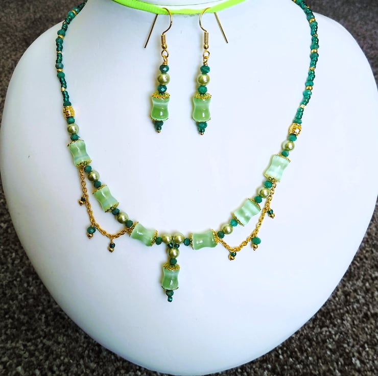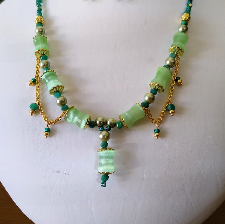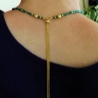 This Stunning, one of a kind handmade necklace with matching earring set is sure to make everyone green with envy. Combining three wonderful green gemstones, Selenite, shell pearls and faceted Amazonite, this set exude a sense of elegance, vitality, and nature’s beauty. It is finished with tiny glass dark green seed beads, gold plated metal chain, spacers and an easily adjustable sliding bead clasp. This sliding bead clasp allows the wearer to easily pop on the necklace over the head and then adjust it from approx 26 inches down to 18 inches, to achieve the desired length suitable for the neckline of your outfit.