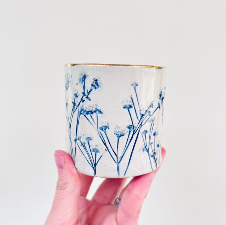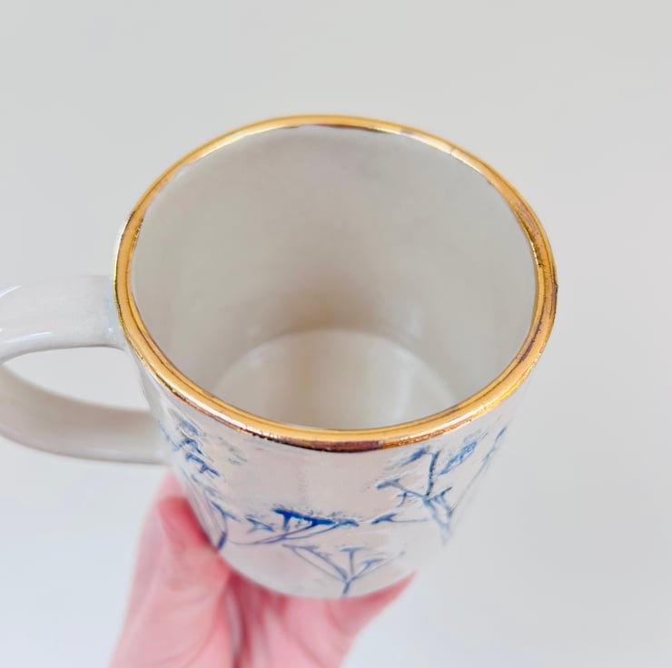 Each mug is hand built using the slab-building technique and then pressed with plants and flowers from my garden making each one totally unique. This one is finished with a 24k gold rim.