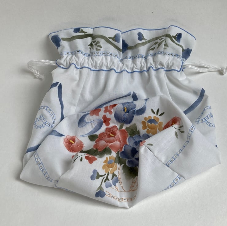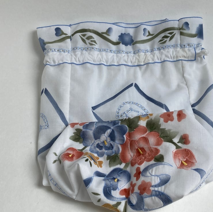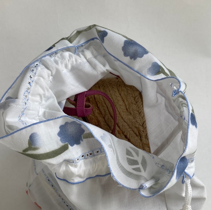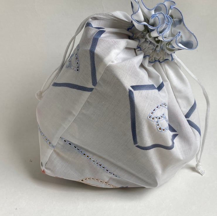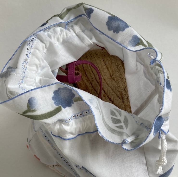 This useful bag is made from a vintage tablecloth, making the best of the decoration and pretty edges, whilst creating a roomy bag. The top has a simple drawstring which is easy to open or close and will help to keep the contents safe. Measuring approximately 30cm x 40cm this bag is easily big enough to hold a couple of pairs of shoes, a good stash of socks and pants or a load of dirties. For convenience you could use the drawstring to hang the bag on a hook or door handle. When you get home, pop the bag in the washing machine with your other laundry and then it’ll be clean and ready for your next adventure.