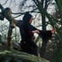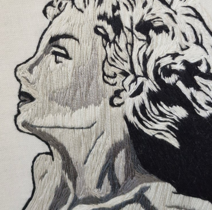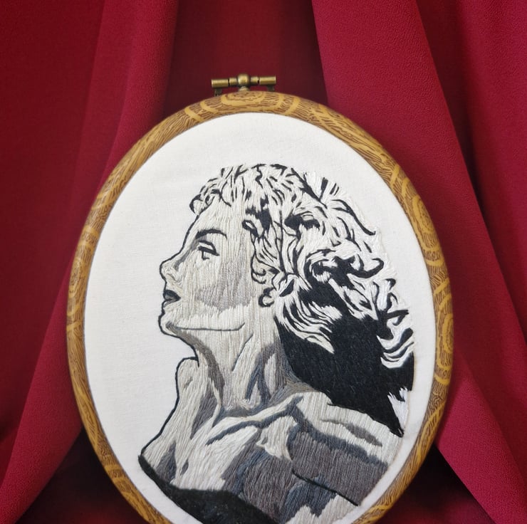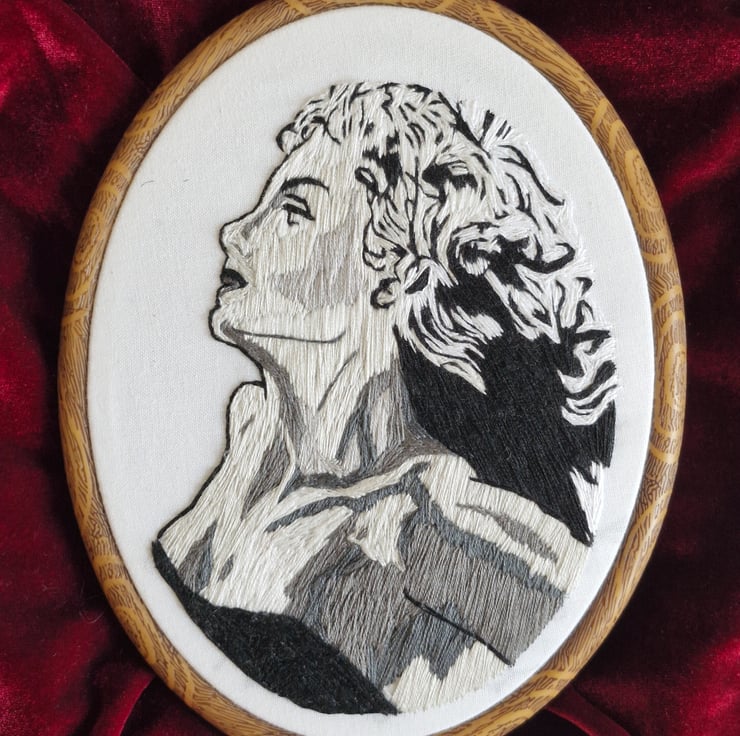 Hand stitched embroidery art of unnamed pen and ink illustration by American pulp fiction legend Virgil Finlay (1914 - 1971) stitched with black, white and grey monochrome thread on white cotton polyester fabric and framed in faux wood plastic hoop (15cm x 19cm)
