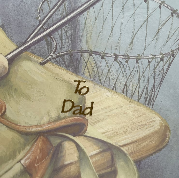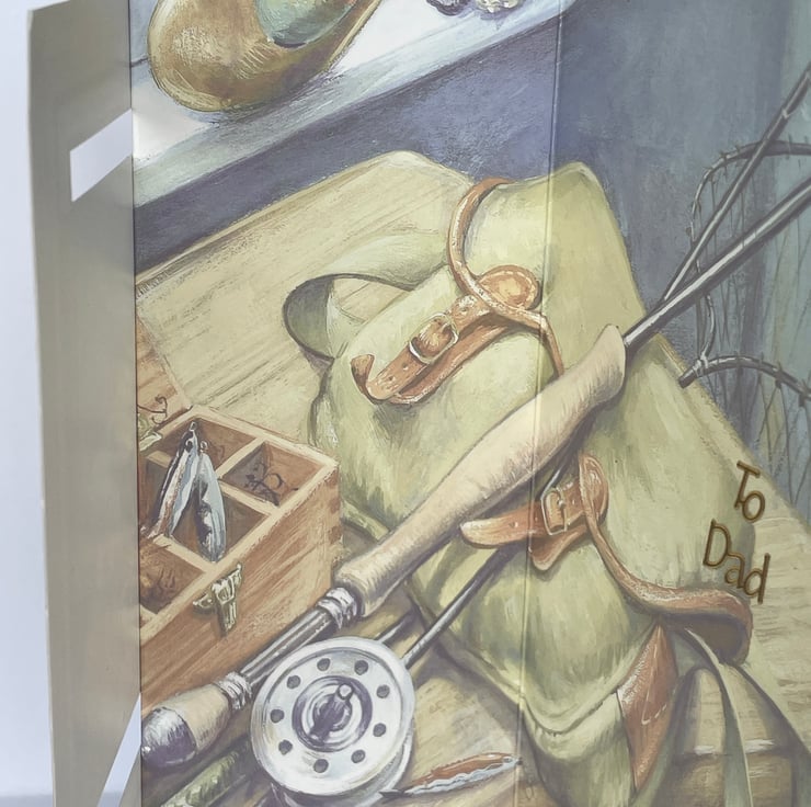 Do you know a keen fisherman? Then this is the card for them. This A5 card features a fold back design. The background card has a muted image of fishing equipment with a leaf and swirl design to the edge. The main design shows all all the fishing equipment you would need from rods, flies, reels and a creel. This has a gold border and is surrounded with a gold frame. The design has rounded corners and is a fold back card so the main image appears to be floating off the edge. The design has a To Dad added so it can be used for birthdays or Father's Day, whatever you want.