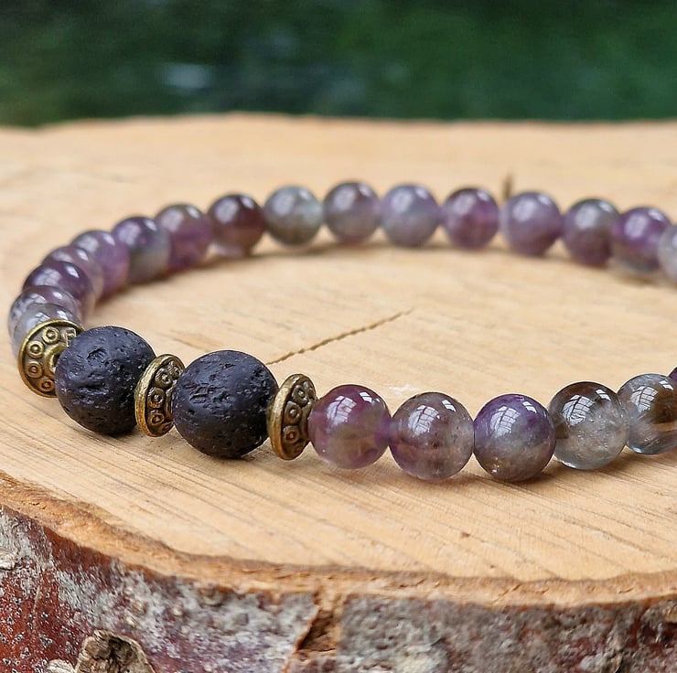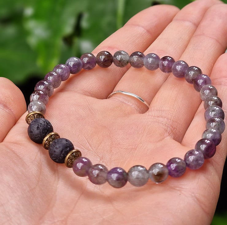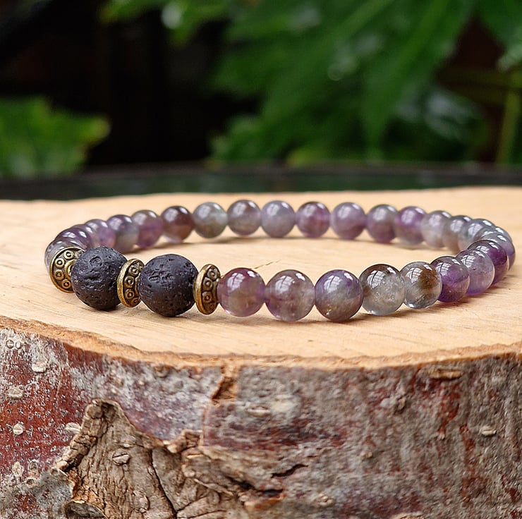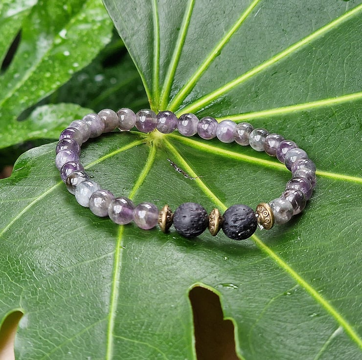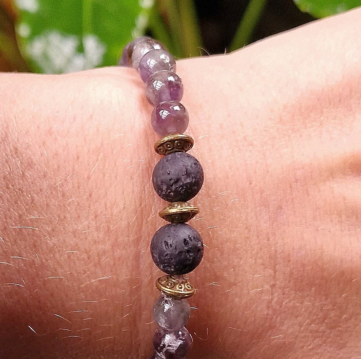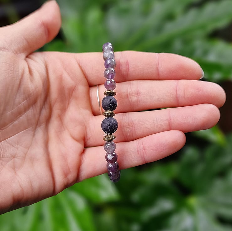 Wear your favourite Essential oil with our gemstone beaded diffuser bracelets. This particular bracelet holds Purple Amethyst and lava stone beads.