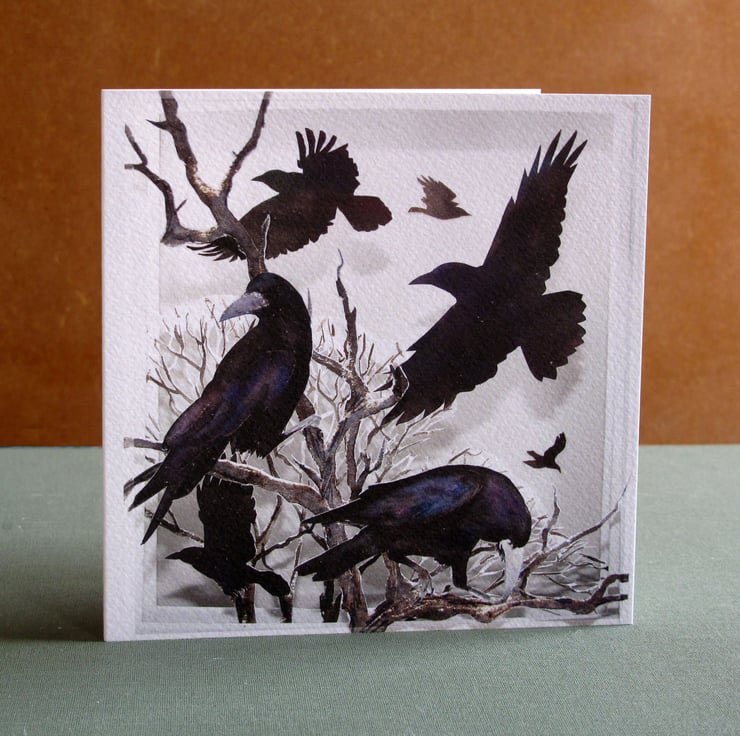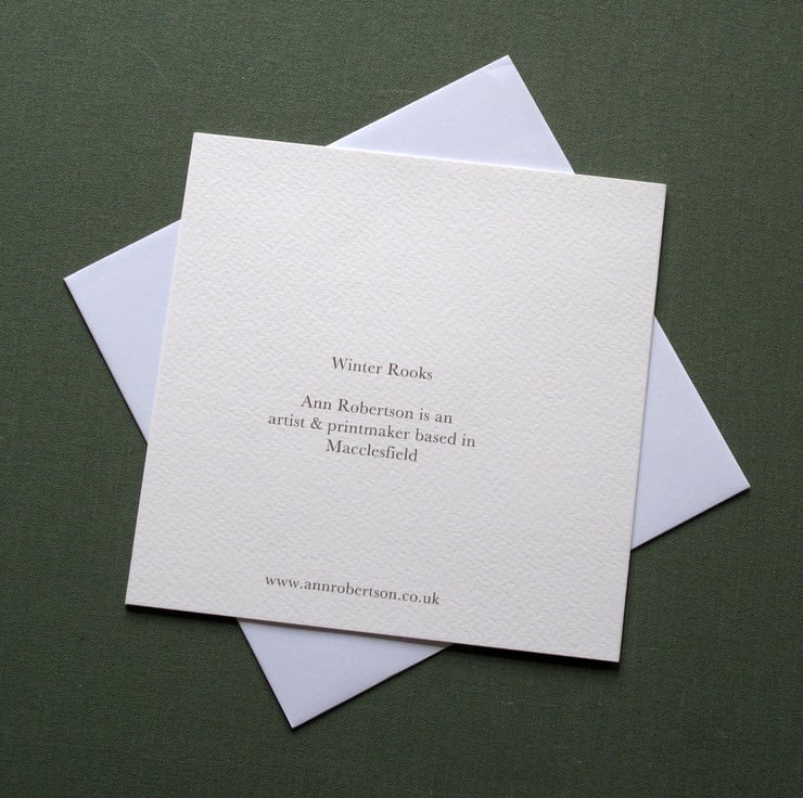 Blank greeting card. Original art work by Ann Robertson. Printed on high quality Tintoretto Gesso paper with a hammered finish. Square card 14.8cm x 14.8 cm. Side fold. Plain white envelope.