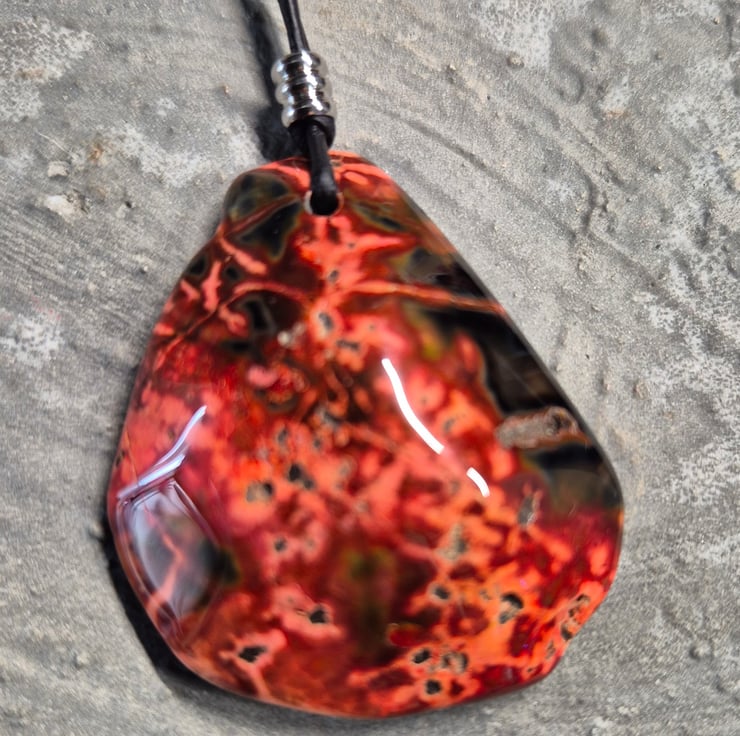 Red and black free form pendant and black leather cord with stainless steel connector and slider.