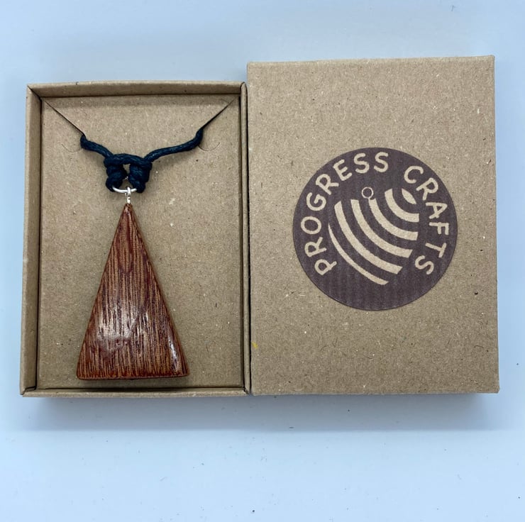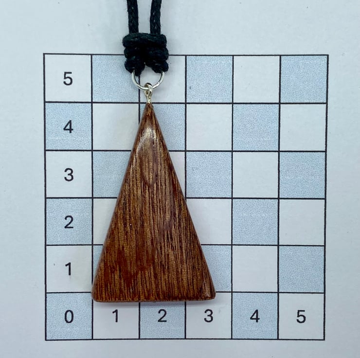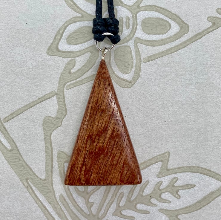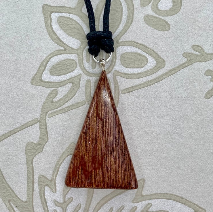 A glossy handmade triangle wood pendant with a hard wax polish. This is a simple triangle shape which shows off the amazing colour and grain of this wood. It’s quite a light piece.