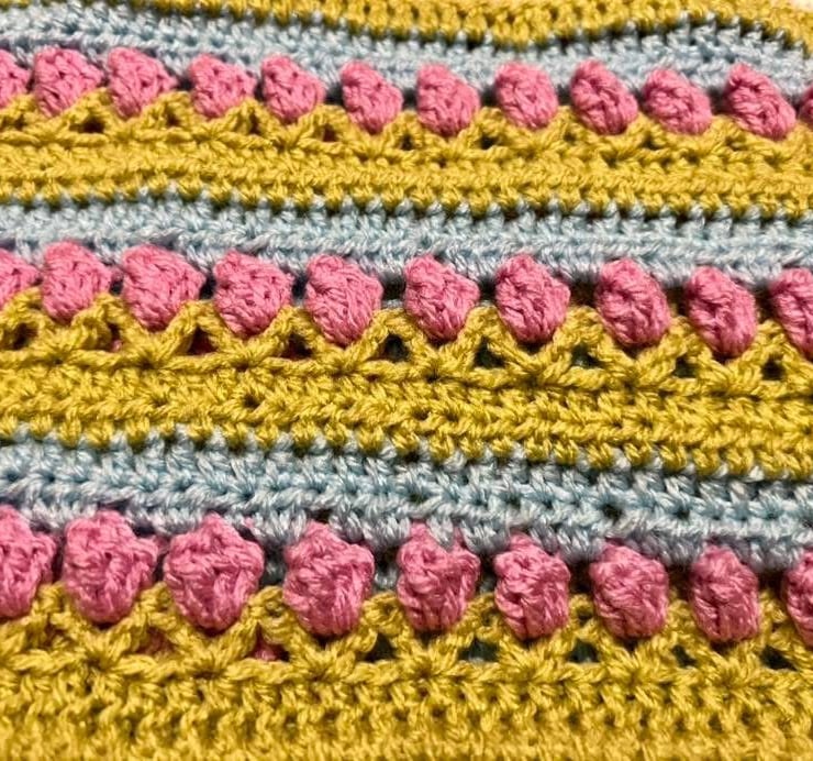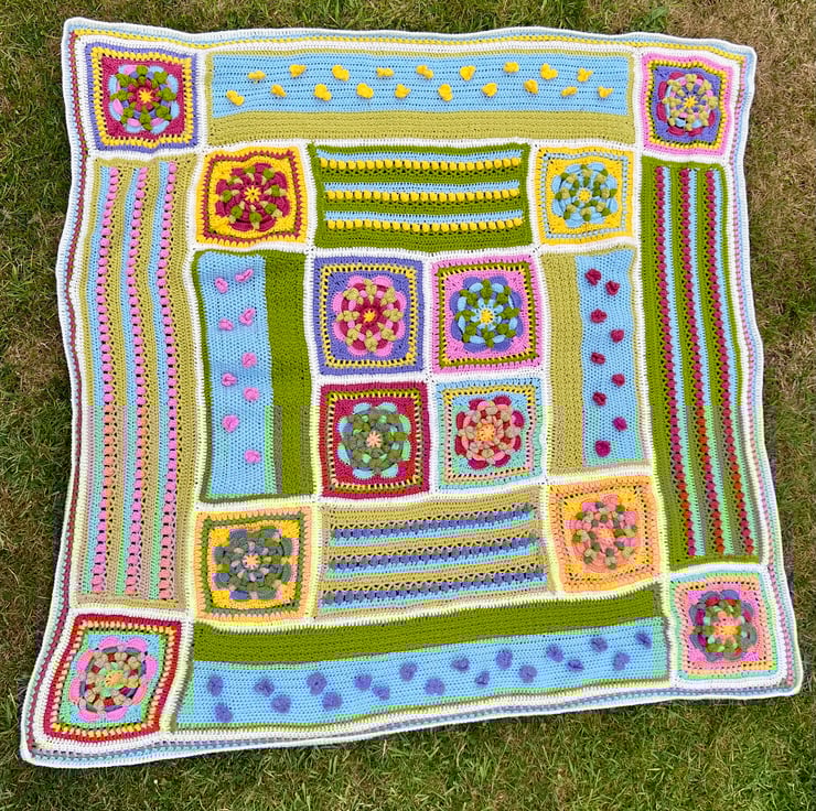 This generously sized blanket (approx. 58” x 58” / 147cm x 147cm) is made up of cheerful squares and panels, each bursting with joyful colour and texture – a celebration of spring in stitch form! Designed by Helen Smith, the pattern brings together timeless crochet techniques with fresh, floral-inspired charm.
