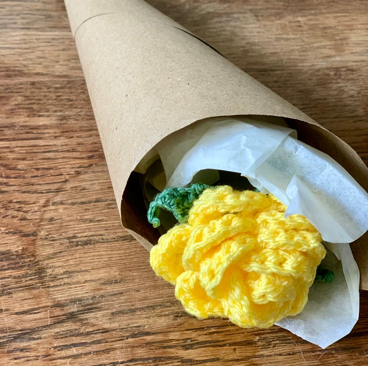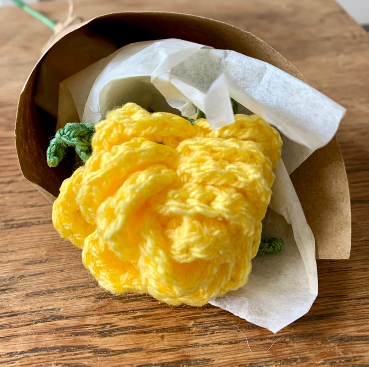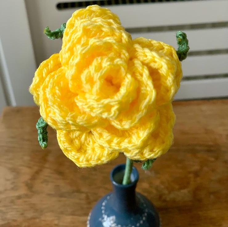 Crochet yellow rose, a symbol of friendship. And is often given to express gratitude. This handmade flower would make the perfect present for a best friend, for a June birthday or as a thank you.