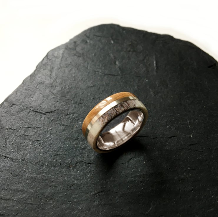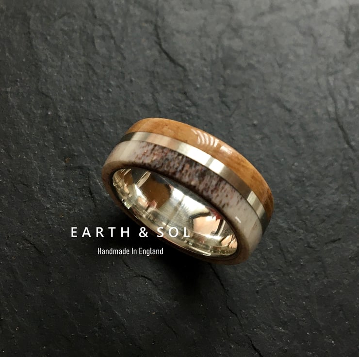 Deer Antler Ring. Oak Wood Ring With Sterling Silver Band. Whiskey Barrel Oak