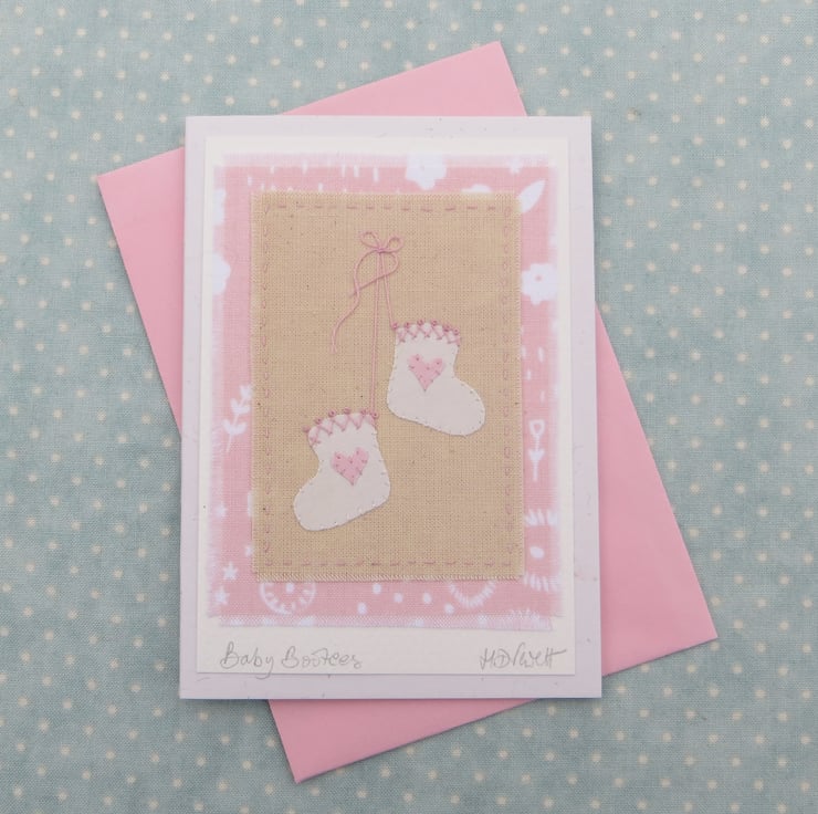 Designed to celebrate the arrival of a baby girl (or Christening) the miniature hand-stitched applique bootees are backed with a pretty cotton print background fabric. Hand embroidered details and two tiny applique hearts complete the design.