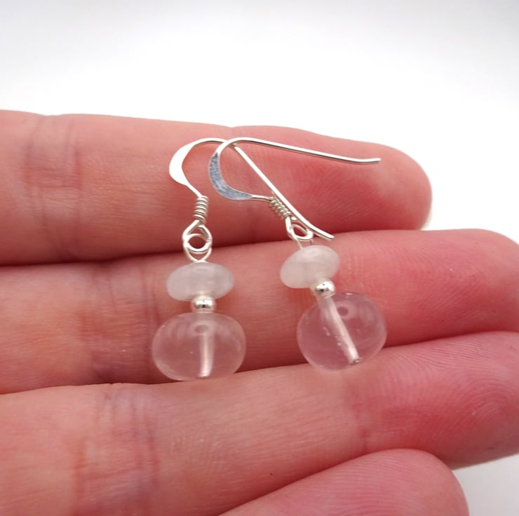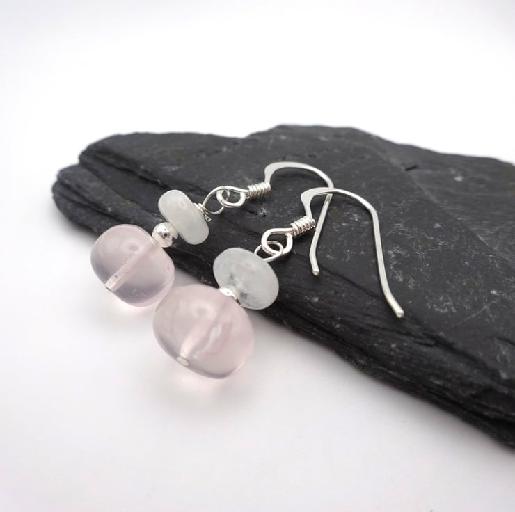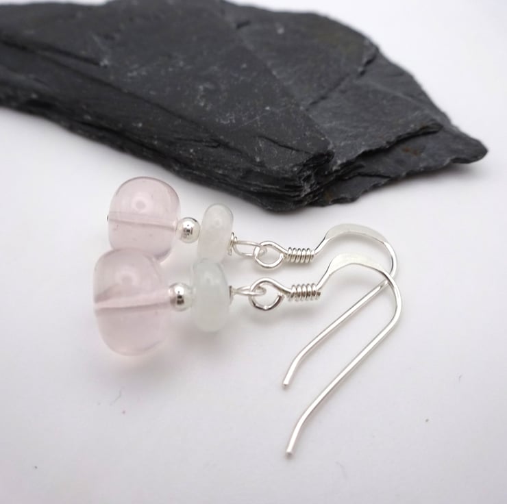 A pair of sterling silver earrings which feature Rose Quartz and rainbow moonstone gemstone beads.