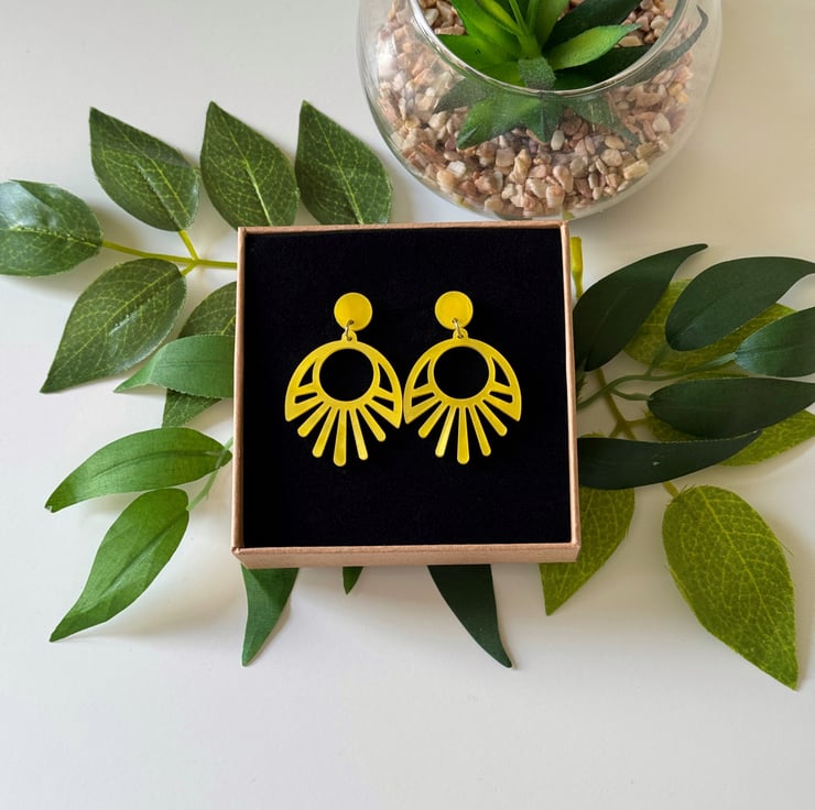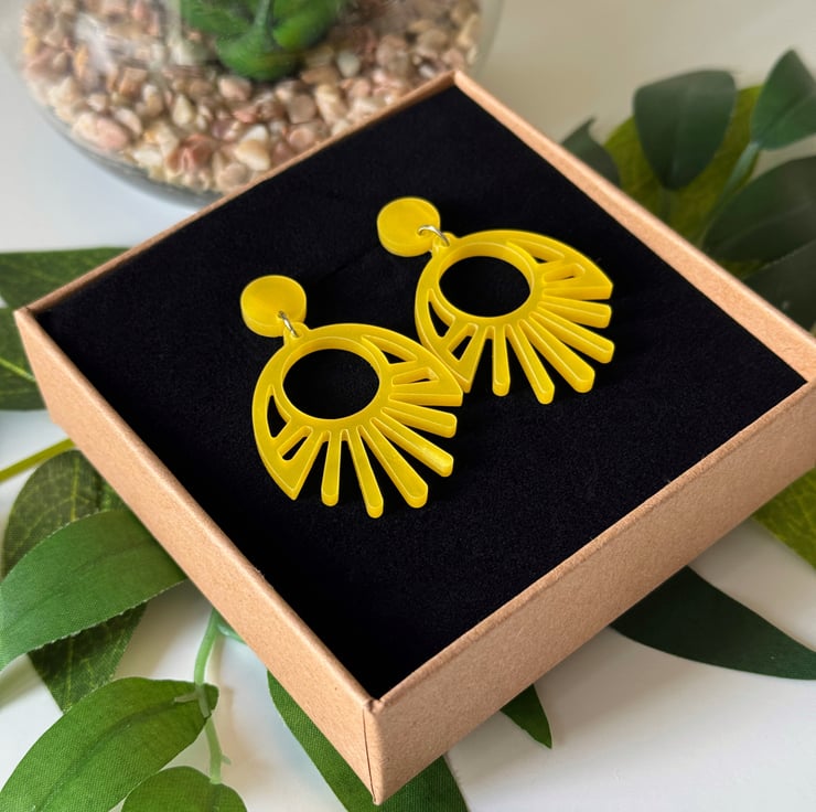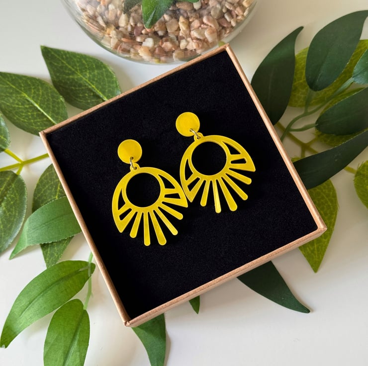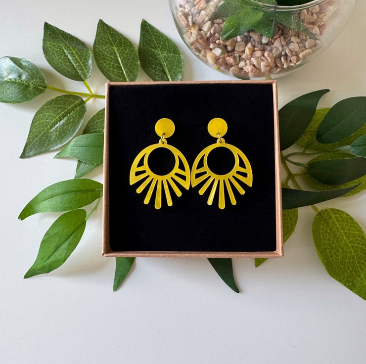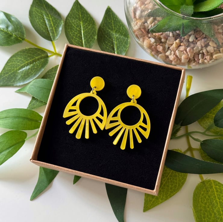 Comprising of a small circle stud top and featuring a stunning bold geometric stylised radial sunbeam design.