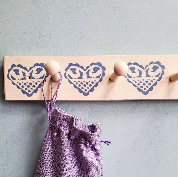 This is an attractive and decorative coat rack for the bedroom or bathroom. It is painted with folklore style hearts in dusky blue on cream .