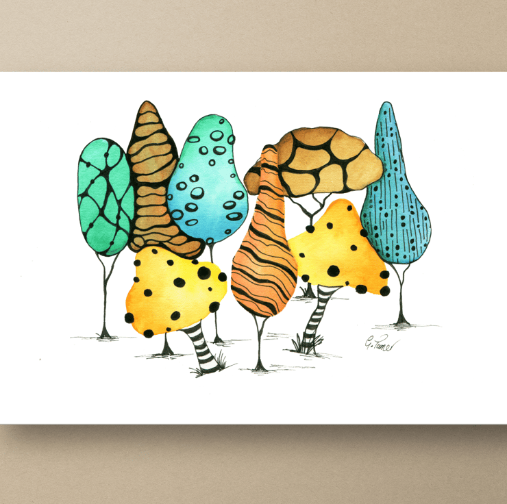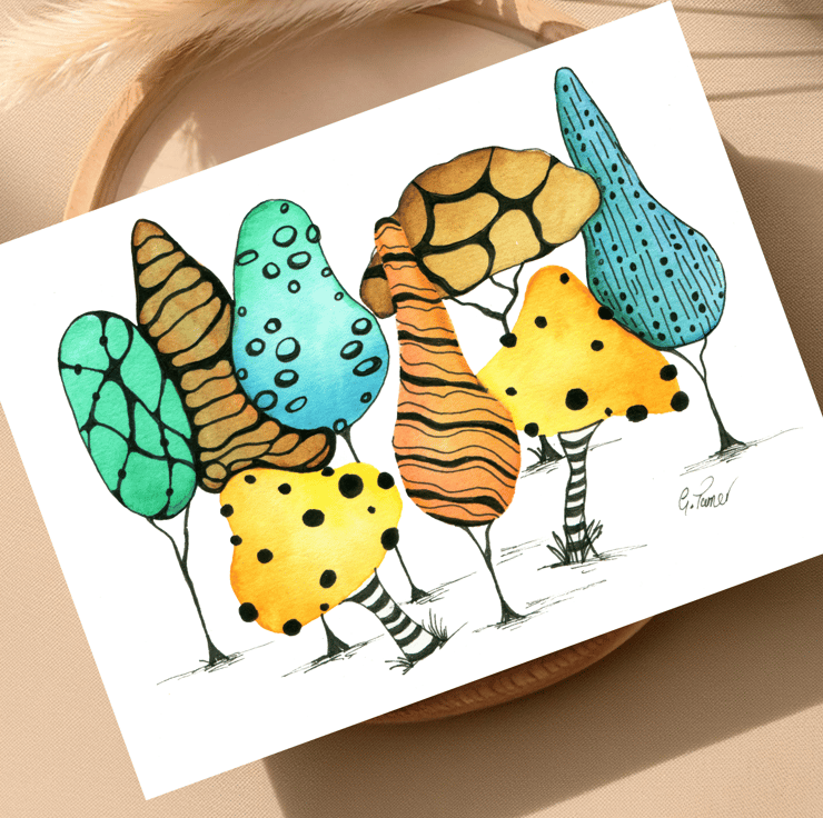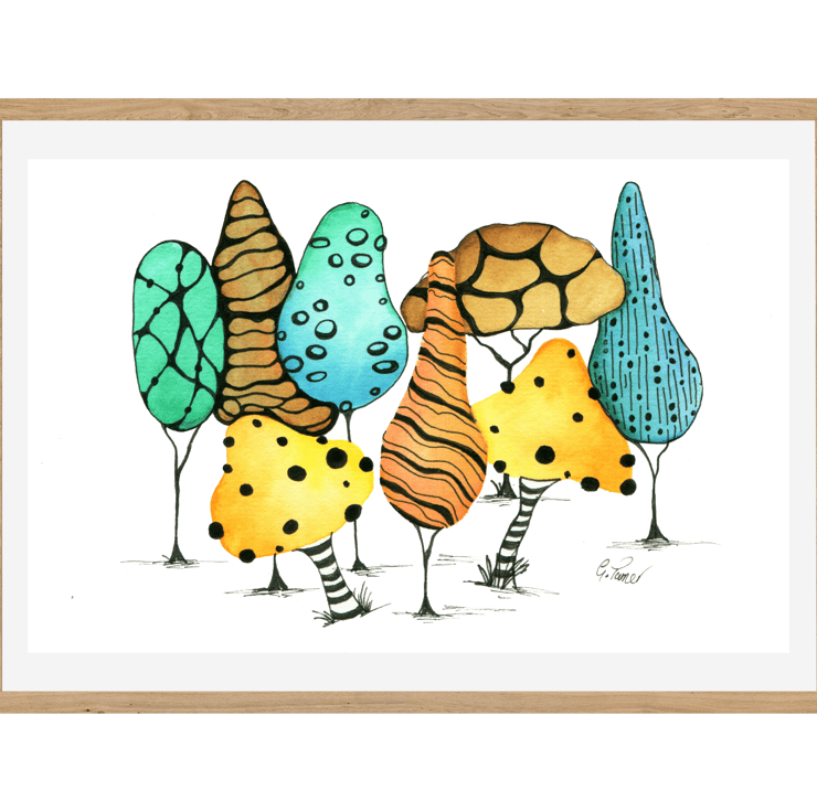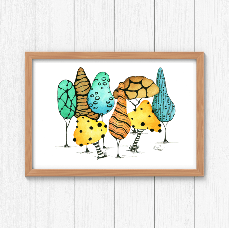 Abstract watercolour woodland mushroom print of my original art piece, painted on watercolour paper with Windsor and Newton professional watercolours. This particular piece uses greens and oranges as contrasting colours