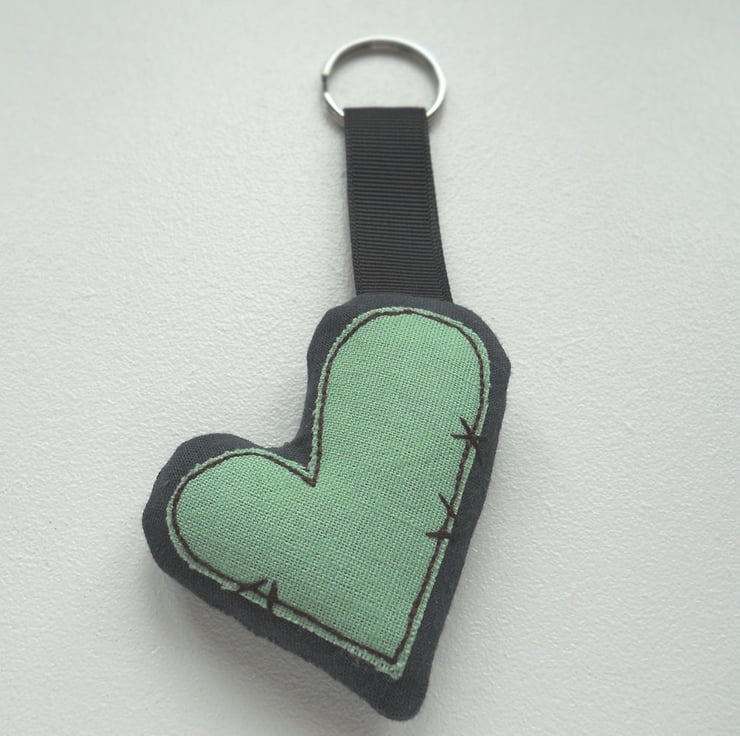 applique and free motion embroidered zombie heart keyring - willow green, only 1 available.