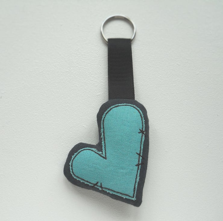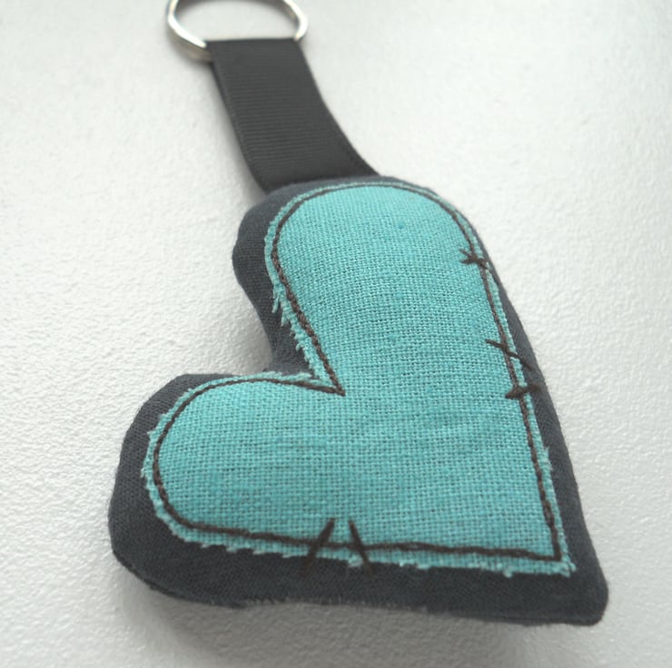 applique and free motion embroidered zombie heart keyring - aqua (but more green than turquoise-y) linen, only 1 available - the heart in the photo is the one you will receive.