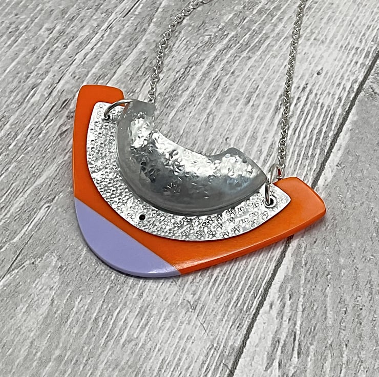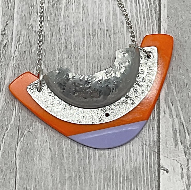Handmade necklace made from recycled aluminium drink can complemented with the addition of a acrylic shape. The design focuses on the metal base of the can incorporating the domed shape which I have cut and shaped with added hammered texture, giving this necklace it’s unique and one-of-a-kind individuality. The acrylic is cut by hand into a rounded design in a dual colour combination of bold orange and a delicate lilac, this is riveted to the metal using aluminium tubing. Eco-friendly material and lightweight and comfortable to wear for all occasions.