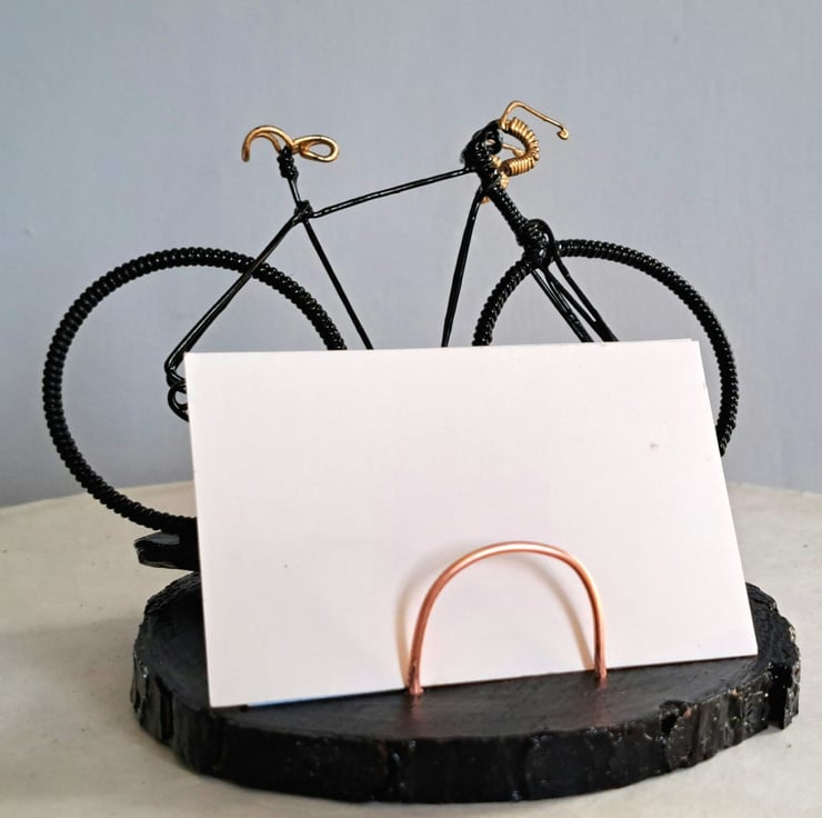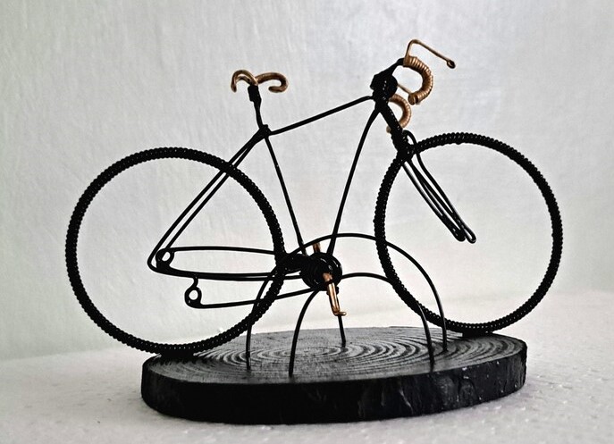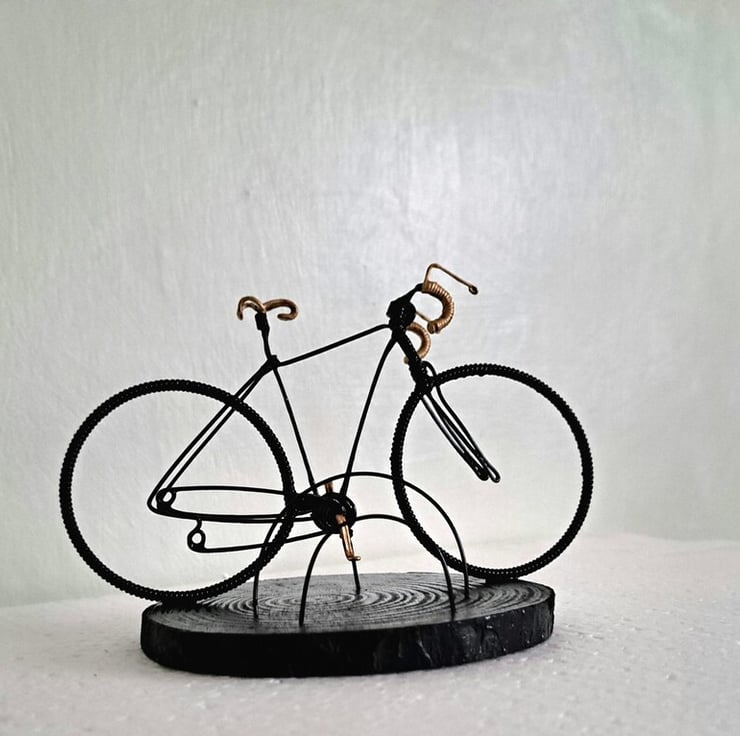 The bicycle is approximately 9cm long on a 10-11cm wooden plinth.