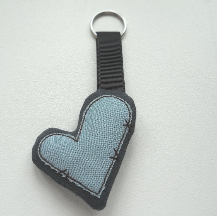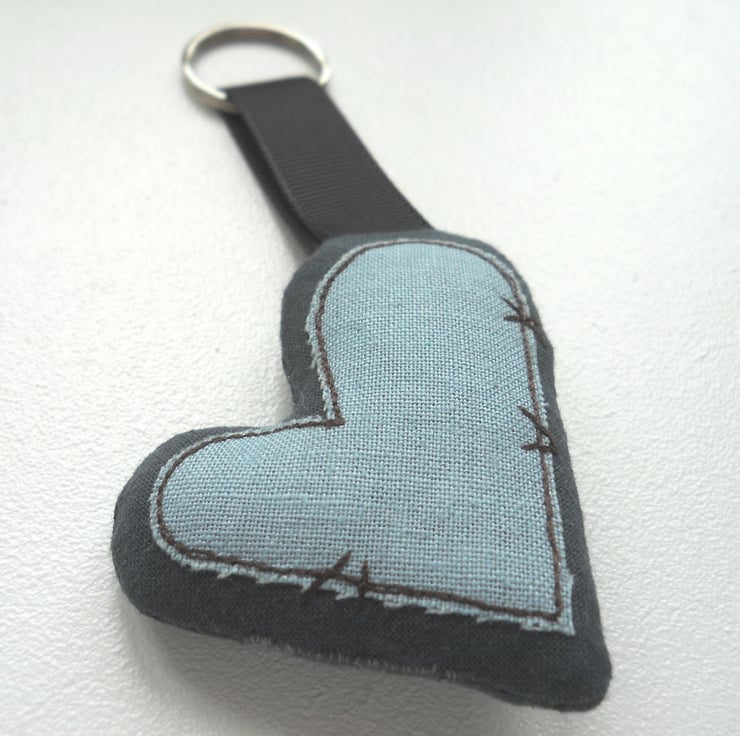 applique and free motion embroidered zombie heart keyring - smokey blue / grey linen, only 1 available - the heart in the photo is the one you will receive.